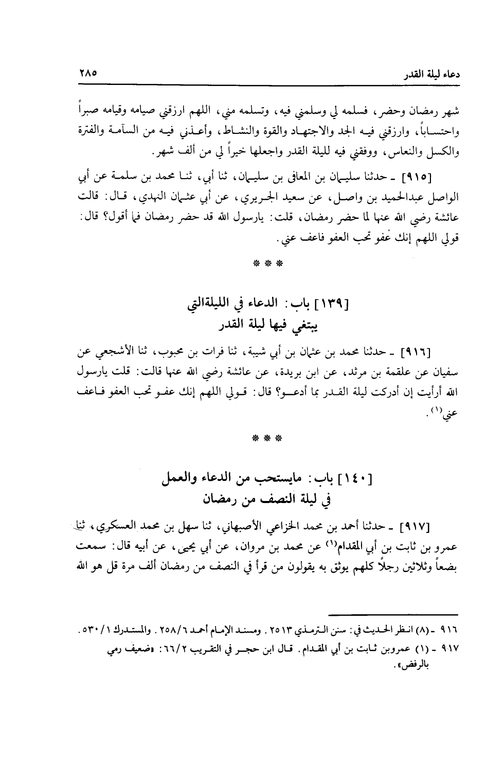 915 - حَدَّثَنَا سُلَيْمَانُ بْنُ الْمُعَافَى بْنِ سُلَيْمَانَ، ثنا أَبِي، ثنا مُحَمَّدُ بْنُ سَلَمَةَ، عَنْ أَبِي الْوَاصِلِ عَبْدِ الْحَمِيدِ بْنِ وَاصِلٍ، عَنْ سَعِيدٍ الْجُرَيْرِيِّ، عَنْ أَبِي عُثْمَانَ النَّهْدِيِّ، قَالَ: قَالَتْ عَائِشَةُ رَضِيَ اللَّهُ عَنْهَا: لَمَّا حَضَرَ رَمَضَانُ قُلْتُ: يَا رَسُولَ اللَّهِ، قَدْ حَضَرَ رَمَضَانُ، فَمَا أَقُولُ؟ قَالَ: " قُولِي: §اللَّهُمَّ إِنَّكَ عَفُوٌّ تُحِبُّ الْعَفْوَ فَاعْفُ عَنِّي "