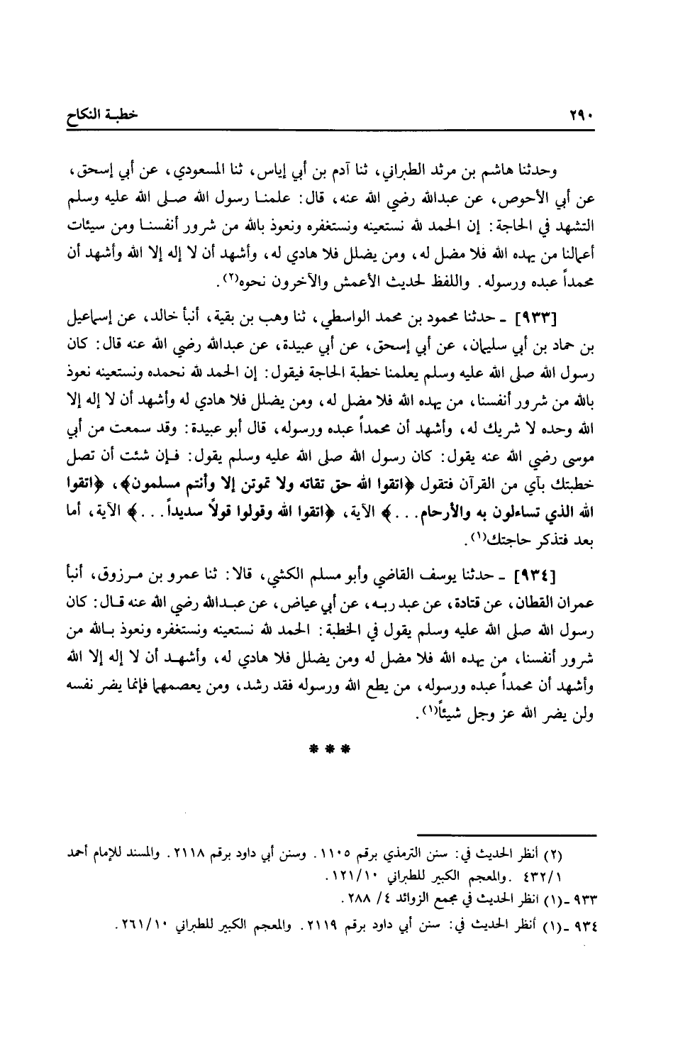 933 - حَدَّثَنَا مَحْمُودُ بْنُ مُحَمَّدٍ الْوَاسِطِيُّ، ثنا وَهْبُ بْنُ بَقِيَّةَ، أَنْبَأَ خَالِدٌ، عَنْ إِسْمَاعِيلَ بْنِ حَمَّادِ بْنِ أَبِي سُلَيْمَانَ، عَنْ أَبِي إِسْحَاقَ، عَنْ أَبِي عُبَيْدَةَ، عَنْ عَبْدِ اللَّهِ، رَضِيَ اللَّهُ عَنْهُ قَالَ: كَانَ رَسُولُ اللَّهِ صَلَّى اللهُ عَلَيْهِ وَسَلَّمَ يُعَلِّمُنَا §خُطْبَةَ الْحَاجَةِ فَيَقُولُ: «إِنَّ الْحَمْدَ لِلَّهِ، نَحْمَدُهُ وَنَسْتَعِينُهُ، نَعُوذُ بِاللَّهِ مِنْ شُرُورِ أَنْفُسِنَا، مَنْ يَهْدِهِ اللَّهُ فَلَا مُضِلَّ لَهُ، وَمَنْ يُضْلِلْ فَلَا هَادِيَ لَهُ، وَأَشْهَدُ أَنْ لَا إِلَهَ إِلَّا اللَّهُ وَحْدَهُ لَا شَرِيكَ لَهُ، وَأَشْهَدُ أَنَّ مُحَمَّدًا عَبْدُهُ وَرَسُولُهُ» قَالَ أَبُو عُبَيْدَةَ: وَقَدْ سَمِعْتُ مِنَ أَبِي مُوسَى رَضِيَ اللَّهُ عَنْهُ يَقُولُ: كَانَ رَسُولُ اللَّهِ صَلَّى اللهُ عَلَيْهِ وَسَلَّمَ يَقُولُ: " فَإِنْ شِئْتَ أَنْ تَصِلَ خُطْبَتَكَ بِآيٍ مِنَ الْقُرْآنِ فَتَقُولُ {اتَّقُوا اللَّهَ حَقَّ تُقَاتِهِ وَلَا تَمُوتُنَّ إِلَّا وَأَنْتُمْ مُسْلِمُونَ} [آل عمران: 102] {اتَّقُوا اللَّهَ الَّذِي تَسَاءَلُونَ بِهِ وَالْأَرْحَامَ} [النساء: 1] الْآيَةَ {اتَّقُوا اللَّهَ وَقُولُوا قَوْلًا سَدِيدًا} [الأحزاب: 70] الْآيَةَ أَمَّا بَعْدُ، فَتَذْكُرُ حَاجَتَكَ "