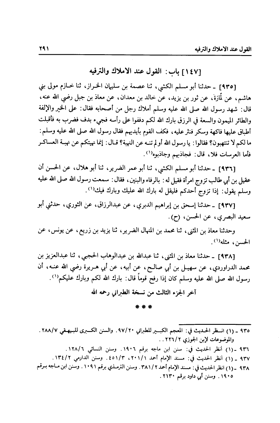 935 - حَدَّثَنَا أَبُو مُسْلِمٍ الْكَشِّيُّ، ثنا عِصْمَةُ بْنُ سُلَيْمَانَ الْخَرَّازُ، ثنا خَازِمٌ مَوْلَى بَنِي هَاشِمٍ، عَنْ لِمَازَةَ، عَنْ ثَوْرِ بْنِ يَزِيدَ، عَنْ خَالِدِ بْنِ مَعْدَانَ، عَنْ مُعَاذِ بْنِ جَبَلٍ، رَضِيَ اللَّهُ عَنْهُ قَالَ: شَهِدَ رَسُولُ اللَّهِ صَلَّى اللهُ عَلَيْهِ وَسَلَّمَ إِمْلَاكَ رَجُلٍ مِنْ أَصْحَابِهِ فَقَالَ: «§عَلَى الْخَيْرِ وَالْإِلْفَةِ وَالطَّائِرِ الْمَيْمُونِ، وَالسَّعَةِ فِي الرِّزْقِ، بَارَكَ اللَّهُ لَكُمْ، دَفِّفُوا عَلَى رَأْسِهِ» فَجِيءَ بِدُفٍّ فَضُرِبَ بِهِ، فَأَقْبَلَتْ أَطْبَاقٌ عَلَيْهَا فَاكِهَةٌ وَسُكَّرٌ، فَنُثِرَ عَلَيْهِ فَكَفَّ الْقَوْمُ أَيْدِيَهُمْ، فَقَالَ رَسُولُ اللَّهِ صَلَّى اللهُ عَلَيْهِ وَسَلَّمَ: «مَا لَكُمْ لَا تَنْتَهِبُونَ؟» فَقَالُوا: يَا رَسُولَ اللَّهِ أَوَلَمْ تَنْهَ عَنِ النُّهْبَةِ؟ قَالَ: «إِنَّمَا نَهَيْتُكُمْ عَنْ نُهْبَةِ الْعَسَاكِرِ، فَأَمَّا الْعُرْسَاتُ فَلَا» قَالَ: فَجَاذَبَهُمْ وَجَاذَبُوهُ