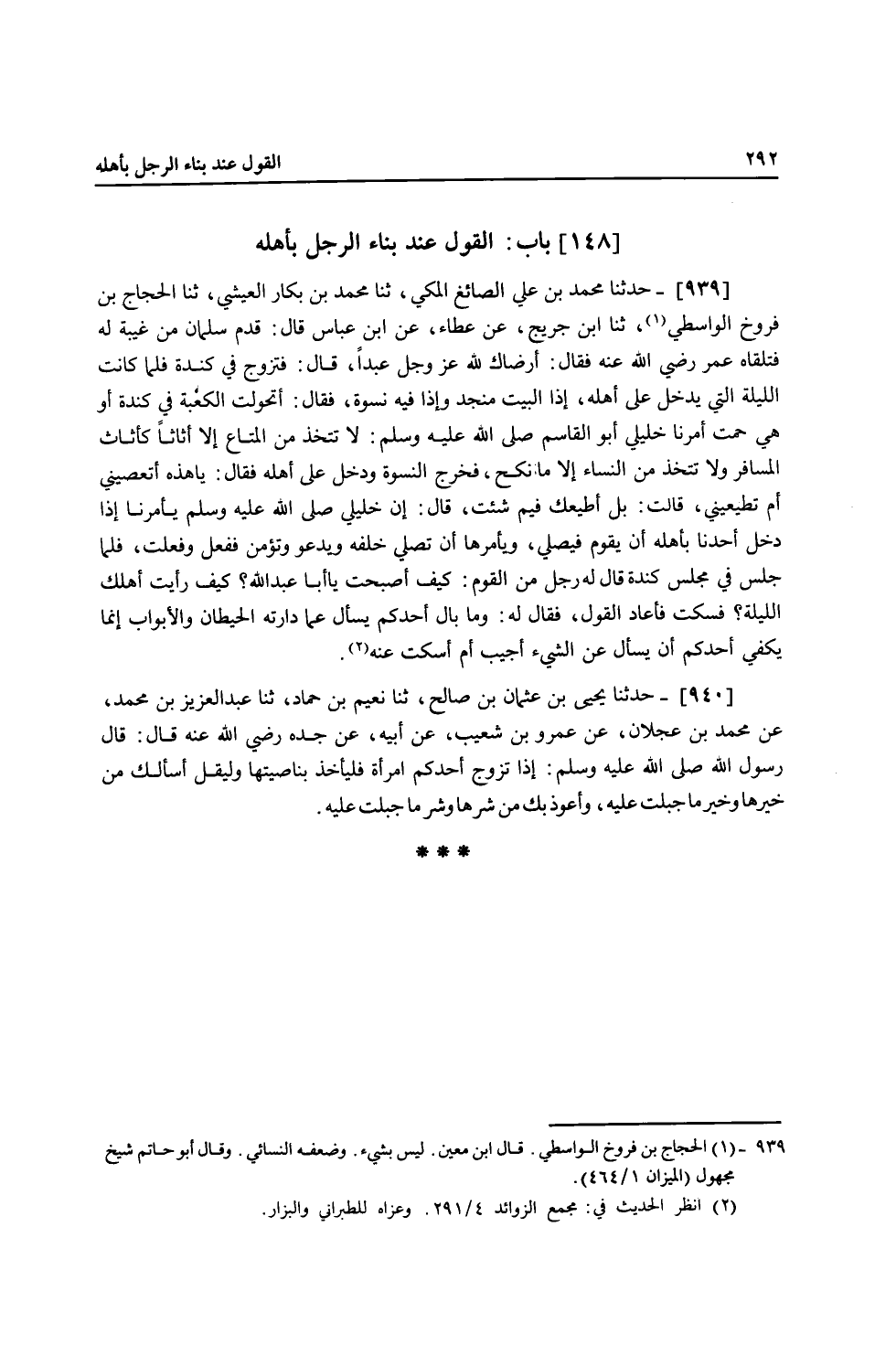 939 - حَدَّثَنَا مُحَمَّدُ بْنُ عَلِيٍّ الصَّائِغُ الْمَكِّيُّ، ثنا مُحَمَّدُ بْنُ بَكَّارٍ الْعَيْشِيُّ، ثنا الْحَجَّاجُ بْنُ فَرُّوخَ الْوَاسِطِيُّ، ثنا ابْنُ جُرَيْجٍ، عَنْ عَطَاءٍ، عَنِ ابْنِ عَبَّاسٍ، قَالَ: قَدِمَ سَلْمَانُ مِنْ غَيْبَةٍ لَهُ فَتَلَقَّاهُ عُمَرُ رَضِيَ اللَّهُ عَنْهُ فَقَالَ: أَرْضَاكَ لِلَّهِ عَزَّ وَجَلَّ عَبْدًا قَالَ: فَتَزَوَّجَ فِي كِنْدَةَ، فَلَمَّا كَانَتِ اللَّيْلَةُ الَّتِي يَدْخُلُ عَلَى أَهْلِهِ، إِذَا الْبَيْتُ مُنَجَّدٌ وَإِذَا فِيهِ نِسْوَةٌ، فَقَالَ: أَتَحَوَّلَتِ الْكَعْبَةُ فِي كِنْدَةَ أَوْ هِيَ حُمَّتْ، أَمَرَنَا خَلِيلِي أَبُو الْقَاسِمِ صَلَّى اللهُ عَلَيْهِ وَسَلَّمَ: «§لَا تَتَّخِذْ مِنَ الْمَتَاعِ إِلَّا أَثَاثًا كَأَثَاثِ الْمُسَافِرِ، وَلَا تَتَّخِذْ مِنَ النِّسَاءِ إِلَّا مَا تَنْكِحُ» فَخَرَجَ النِّسْوَةُ وَدَخَلَ عَلَى أَهْلِهِ، فَقَالَ: يَا هَذِهِ أَتَعْصِينِي أَمْ تُطِيعِينِي؟ قَالَتْ: بَلْ أُطِيعُكَ فِيمَ شِئْتَ، قَالَ: إِنَّ خَلِيلِي صَلَّى اللهُ عَلَيْهِ وَسَلَّمَ يَأْمُرُنَا إِذَا دَخَلَ أَحَدُنَا بِأَهْلِهِ أَنْ يَقُومَ فَيُصَلِّي وَيَأْمُرُهَا أَنْ تُصَلِّيَ خَلْفَهُ، وَيَدْعُو وَتُؤَمِّنُ، فَفَعَلَ وَفَعَلَتْ، فَلَمَّا جَلَسَ فِي مَجْلِسِ كِنْدَةَ قَالَ لَهُ رَجُلٌ مِنَ الْقَوْمِ: كَيْفَ أَصْبَحْتَ يَا أَبَا عَبْدِ اللَّهِ؟ كَيْفَ رَأَيْتَ أَهْلَكَ اللَّيْلَةَ؟ فَسَكَتَ، فَأَعَادَ الْقَوْلَ، فَقَالَ لَهُ: وَمَا بَالُ أَحَدِكُمْ يَسْأَلُ عَمَّا دَارَتْهُ الْحِيطَانُ وَالْأَبْوَابُ، إِنَّمَا يَكْفِي أَحَدُكُمْ أَنْ يَسْأَلَ عَنِ الشَّيْءِ أُجِيبُ أَمْ أَسْكُتُ عَنْهُ "