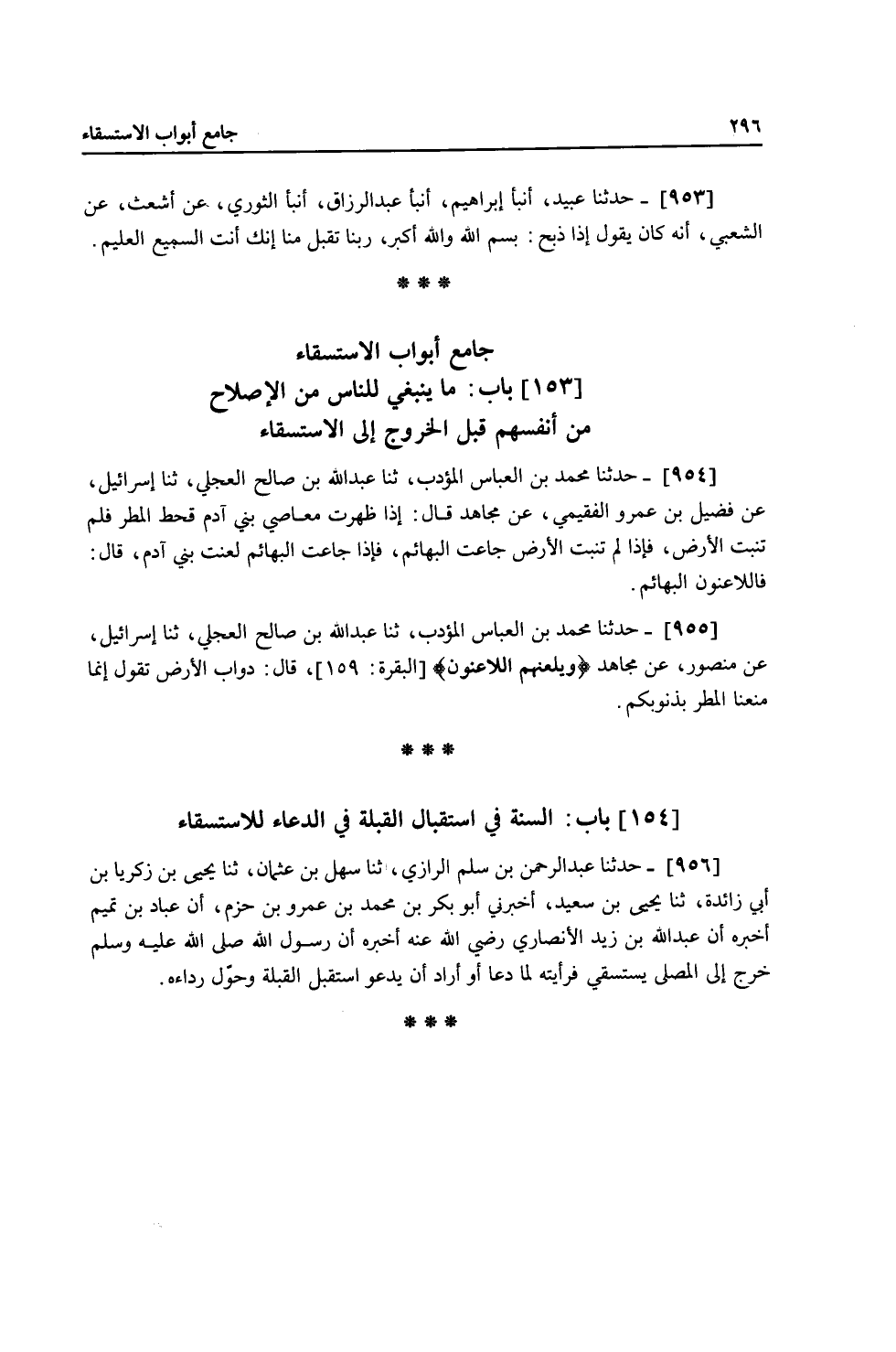 956 - حَدَّثَنَا عَبْدُ الرَّحْمَنِ بْنُ سَلْمٍ الرَّازِيُّ، ثنا سَهْلُ بْنُ عُثْمَانَ، ثنا يَحْيَى بْنُ زَكَرِيَّا بْنِ أَبِي زَائِدَةَ، ثنا يَحْيَى بْنُ سَعِيدٍ، أَخْبَرَنِي أَبُو بَكْرِ بْنُ مُحَمَّدِ بْنِ عَمْرِو بْنِ حَزْمٍ، أَنَّ عَبَّادَ بْنَ تَمِيمٍ، أَخْبَرَهُ أَنَّ عَبْدَ اللَّهِ بْنَ زَيْدٍ الْأَنْصَارِيَّ رَضِيَ اللَّهُ عَنْهُ أَخْبَرَهُ أَنَّ رَسُولَ اللَّهِ صَلَّى اللهُ عَلَيْهِ وَسَلَّمَ «خَرَجَ إِلَى الْمُصَلَّى §يَسْتَسْقِي فَرَأَيْتُهُ لَمَّا دَعَا أَوْ أَرَادَ أَنْ يَدْعُوَ اسْتَقْبَلَ الْقِبْلَةَ وَحَوَّلَ رِدَاءَهُ»