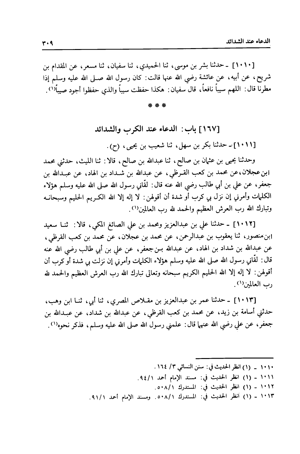 1011 - حَدَّثَنَا بَكْرُ بْنُ سَهْلٍ، ثنا شُعَيْبُ بْنُ يَحْيَى، ح وَحَدَّثَنَا يَحْيَى بْنُ عُثْمَانَ بْنِ صَالِحٍ، ثنا عَبْدُ اللَّهِ بْنُ صَالِحٍ، قَالَا: ثنا اللَّيْثُ، حَدَّثَنِي مُحَمَّدُ بْنُ عَجْلَانَ، عَنْ مُحَمَّدِ بْنِ كَعْبٍ الْقُرَظِيِّ، عَنْ عَبْدِ اللَّهِ بْنِ شَدَّادِ بْنِ الْهَادِ، عَنْ عَبْدِ اللَّهِ بْنِ جَعْفَرٍ، عَنْ عَلِيِ بْنِ أَبِي طَالِبٍ رَضِيَ اللَّهُ عَنْهُ قَالَ: لَقَّانِي رَسُولُ اللَّهِ صَلَّى اللهُ عَلَيْهِ وَسَلَّمَ هَؤُلَاءِ الْكَلِمَاتِ، وَأَمَرَنِي إِنْ نَزَلَ بِي كَرْبٌ أَوْ شِدَّةٌ أَنْ أَقُولَهُنَّ «§لَا إِلَهَ إِلَّا اللَّهُ الْكَرِيمُ الْحَلِيمُ، وَسُبْحَانَهُ وَتَبَارَكَ اللَّهُ رَبُّ الْعَرْشِ الْعَظِيمِ، وَالْحَمْدُ لِلَّهِ رَبِّ الْعَالَمِينَ»