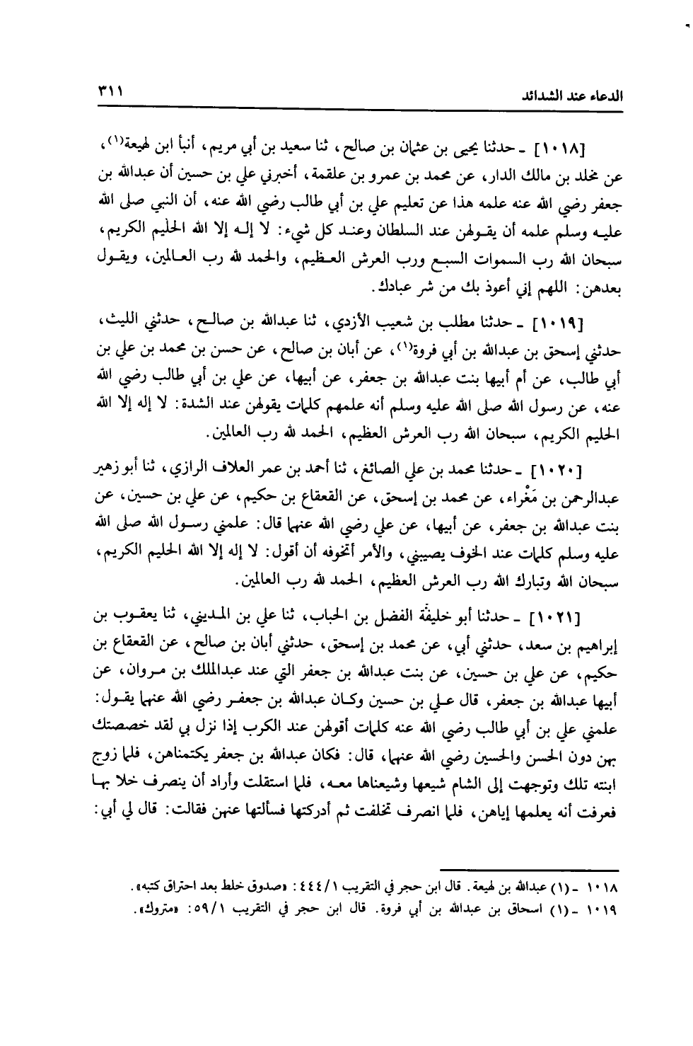 1021 - حَدَّثَنَا أَبُو خَلِيفَةَ الْفَضْلُ بْنُ الْحُبَابِ، ثنا عَلِيُّ بْنُ الْمَدِينِيِّ، ثنا يَعْقُوبُ بْنُ إِبْرَاهِيمَ بْنِ سَعْدٍ، حَدَّثَنِي أَبِي، عَنْ مُحَمَّدِ بْنِ إِسْحَاقَ، حَدَّثَنِي أَبَانُ بْنُ صَالِحٍ، عَنِ الْقَعْقَاعِ بْنِ حَكِيمٍ، عَنْ عَلِيِّ بْنِ حُسَيْنٍ، عَنْ بِنْتِ عَبْدِ اللَّهِ بْنِ جَعْفَرٍ الَّتِي عِنْدَ عَبْدِ الْمَلِكِ بْنِ مَرْوَانَ عَنْ أَبِيهَا عَبْدِ اللَّهِ بْنِ جَعْفَرٍ، قَالَ عَلِيُّ بْنُ حُسَيْنٍ وَكَانَ عَبْدُ اللَّهِ بْنُ جَعْفَرٍ رَضِيَ اللَّهُ عَنْهُمَا يَقُولُ: عَلَّمَنِي عَلِيُّ بْنُ أَبِي طَالِبٍ رَضِيَ اللَّهُ عَنْهُ كَلِمَاتٍ أَقُولُهُنَّ عِنْدَ الْكَرْبِ إِذَا نَزَلَ بِي: لَقَدْ خَصَصْتُكَ بِهِنَّ دُونَ الْحَسَنِ وَالْحُسَيْنِ رَضِيَ اللَّهُ عَنْهُمَا قَالَ: فَكَانَ عَبْدُ اللَّهِ بْنُ جَعْفَرٍ يَكْتُمْنَاهُنَّ، فَلَمَّا زَوَّجَ ابْنَتَهُ تِلْكَ وَتَوَجَّهَتْ إِلَى الشَّامِ شَيَّعَهَا وَشَيَّعْنَاهَا مَعَهُ، فَلَمَّا اسْتَقَلَّتْ وَأَرَادَ أَنْ يَنْصَرِفَ خَلَا بِهَا فَعَرَفْتُ أَنَّهُ يُعَلِّمُهَا إِيَّاهُنَّ، فَلَمَّا انْصَرَفَ تَخَلَّفْتُ ثُمَّ أَدْرَكْتُهَا فَسَأَلْتُهَا عَنْهُنَّ فَقَالَتْ: قَالَ لِي أَبِي -[312]-: بُنَيَّةُ إِنَّكِ تَقْدَمِينَ أَرْضًا أَنْتِ بِهَا غَرِيبَةٌ §فَإِنْ نَزَلَ بِكِ كَرْبٌ أَوْ غَمٌّ فَقُولِي هَؤُلَاءِ الْكَلِمَاتِ: لَا إِلَهَ إِلَّا اللَّهُ الْحَلِيمُ الْكَرِيمُ، تَبَارَكَ اللَّهُ رَبُّ الْعَرْشِ الْعَظِيمِ، الْحَمْدُ لِلَّهِ رَبِّ الْعَالَمِينَ قَالَ الطَّبَرَانِيُّ رَحِمَهُ اللَّهُ: يَرْفَعُهُ يَعْقُوبُ بْنُ إِبْرَاهِيمَ وَزَادَ أَبُو زُهَيْرٍ قَالَ عَبْدُ اللَّهِ بْنُ جَعْفَرٍ عَلَّمَنِي عَمِّي، وَقَالَ: عَلَّمَنِيهِنَّ رَسُولُ اللَّهِ صَلَّى اللهُ عَلَيْهِ وَسَلَّمَ