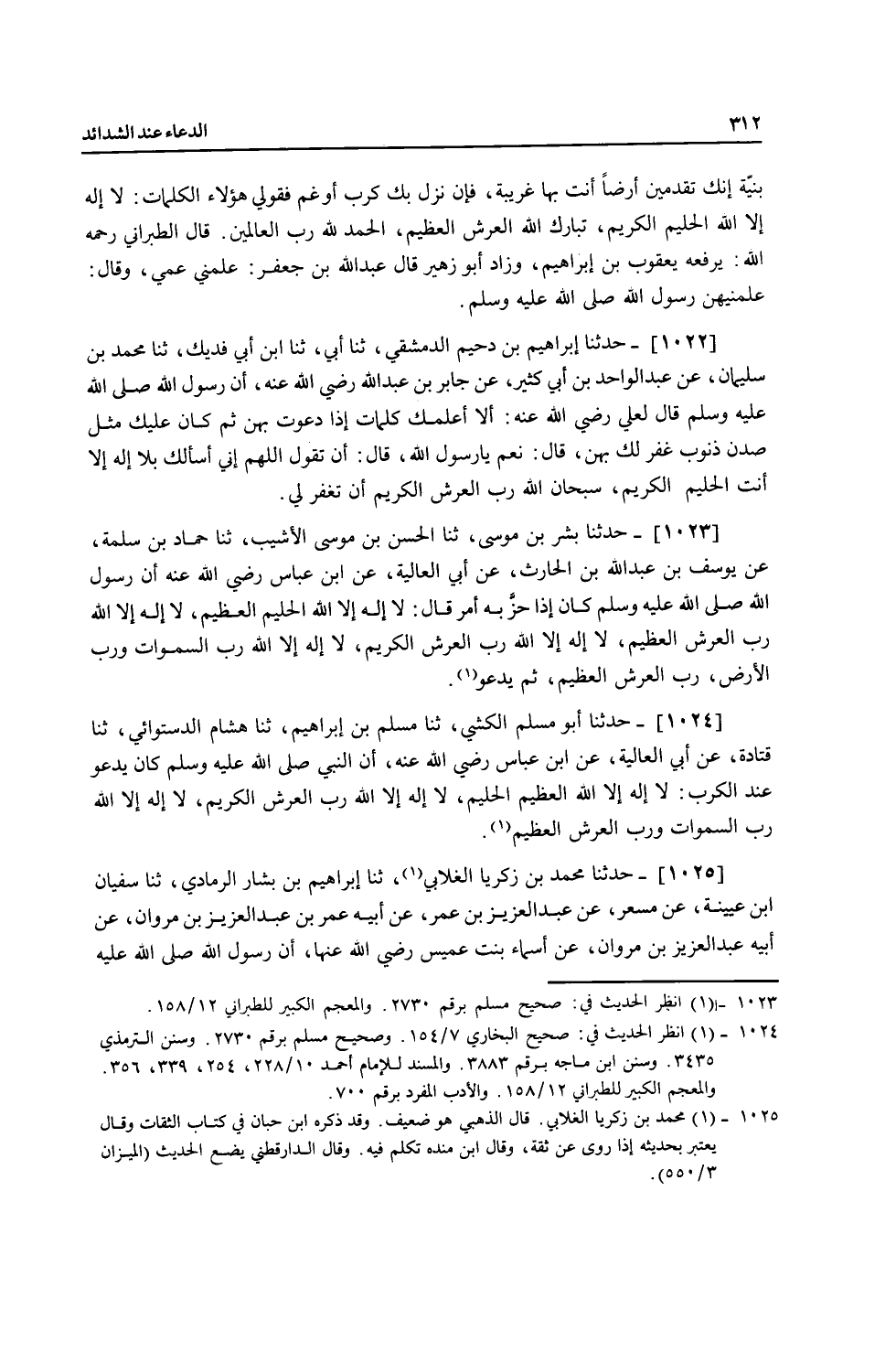 1024 - حَدَّثَنَا أَبُو مُسْلِمٍ الْكَشِّيُّ، ثنا مُسْلِمُ بْنُ إِبْرَاهِيمَ، ثنا هِشَامٌ الدَّسْتُوَائِيُّ، ثنا قَتَادَةُ، عَنْ أَبِي الْعَالِيَةِ، عَنِ ابْنِ عَبَّاسٍ، رَضِيَ اللَّهُ عَنْهُ أَنَّ النَّبِيَّ صَلَّى اللهُ عَلَيْهِ وَسَلَّمَ كَانَ §يَدْعُو عِنْدَ الْكَرْبِ: «لَا إِلَهَ إِلَّا اللَّهُ الْعَظِيمُ الْحَلِيمُ، لَا إِلَهَ إِلَّا اللَّهُ رَبُّ الْعَرْشِ الْكَرِيمِ، لَا إِلَهَ إِلَّا اللَّهُ رَبُّ السَّمَوَاتِ وَرَبِّ الْعَرْشِ الْعَظِيمِ»
