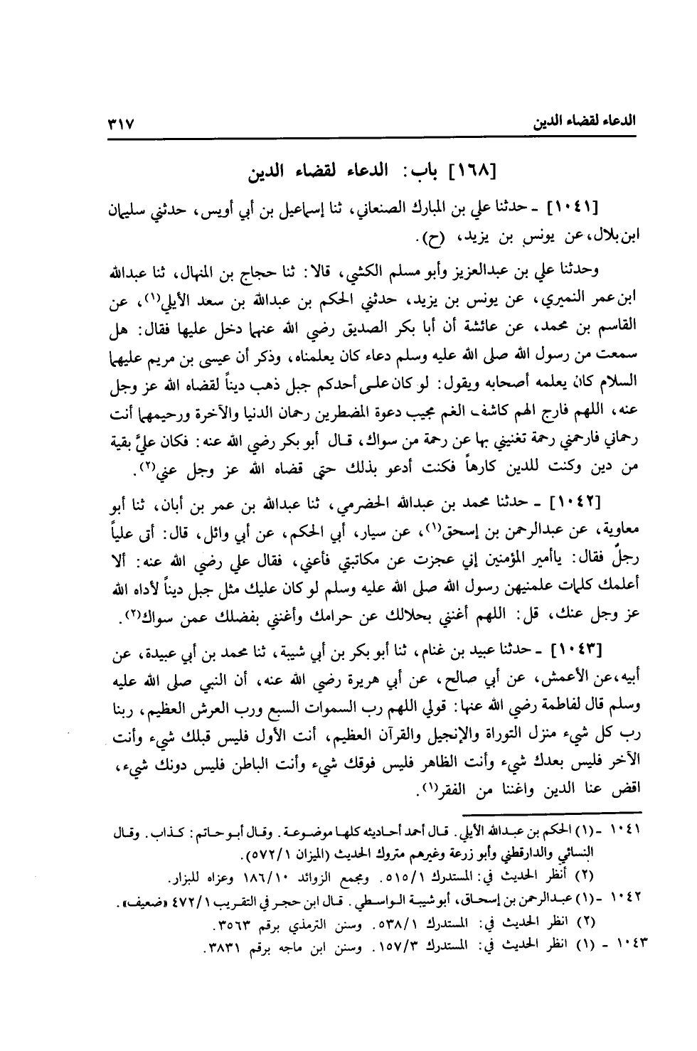 1041 - حَدَّثَنَا عَلِيُّ بْنُ الْمُبَارَكِ الصَّنْعَانِيُّ، ثنا إِسْمَاعِيلُ بْنُ أَبِي أُوَيْسٍ، حَدَّثَنِي سُلَيْمَانُ بْنُ بِلَالٍ، عَنْ يُونُسَ بْنِ يَزِيدَ، ح وَحَدَّثَنَا عَلِيُّ بْنُ عَبْدِ الْعَزِيزِ، وَأَبُو مُسْلِمٍ الْكَشِّيُّ قَالَا: ثنا حَجَّاجُ بْنُ الْمِنْهَالِ، ثنا عَبْدُ اللَّهِ بْنُ عُمَرَ النُّمَيْرِيُّ، عَنْ يُونُسَ بْنِ يَزِيدَ، حَدَّثَنِي الْحَكَمُ بْنُ عَبْدِ اللَّهِ بْنِ سَعْدٍ الْأَيْلِيُّ، عَنِ الْقَاسِمِ بْنِ مُحَمَّدٍ، عَنْ عَائِشَةَ، أَنَّ أَبَا بَكْرٍ الصِّدِّيقَ، رَضِيَ اللَّهُ عَنْهُمَا دَخَلَ عَلَيْهَا فَقَالَ: هَلْ سَمِعْتِ مِنْ رَسُولِ اللَّهِ صَلَّى اللهُ عَلَيْهِ وَسَلَّمَ دُعَاءً كَانَ يُعَلِّمُنَاهُ، وَذَكَرَ أَنَّ عِيسَى ابْنَ مَرْيَمَ عَلَيْهِمَا السَّلَامُ كَانَ يُعَلِّمُهُ أَصْحَابَهُ وَيَقُولُ: " §لَوْ كَانَ عَلَى أَحَدِكُمْ جَبَلٌ ذَهَبَ دَيْنًا لَقَضَاهُ اللَّهُ عَزَّ وَجَلَّ عَنْهُ: اللَّهُمَّ فَارِجَ الْهَمِّ، كَاشِفَ الْغَمِّ، مُجِيبَ دَعْوَةِ الْمُضْطَرِّينَ، رَحْمَانَ الدُّنْيَا وَالْآخِرَةِ وَرِحِيمَهُمَا، أَنْتَ رَحْمَانِي فَارْحَمْنِي رَحْمَةً تُغْنِينِي بِهَا عَنْ رَحْمَةِ مَنْ سِوَاكَ " قَالَ أَبُو بَكْرٍ رَضِيَ اللَّهُ عَنْهُ فَكَانَ عَلَيَّ بَقِيَّةٌ مِنْ دَيْنٍ وَكُنْتُ لِلدَّيْنِ كَارِهًا فَكُنْتُ أَدْعُو بِذَلِكَ حَتَّى قَضَاهُ اللَّهُ عَزَّ وَجَلَّ عَنِّي