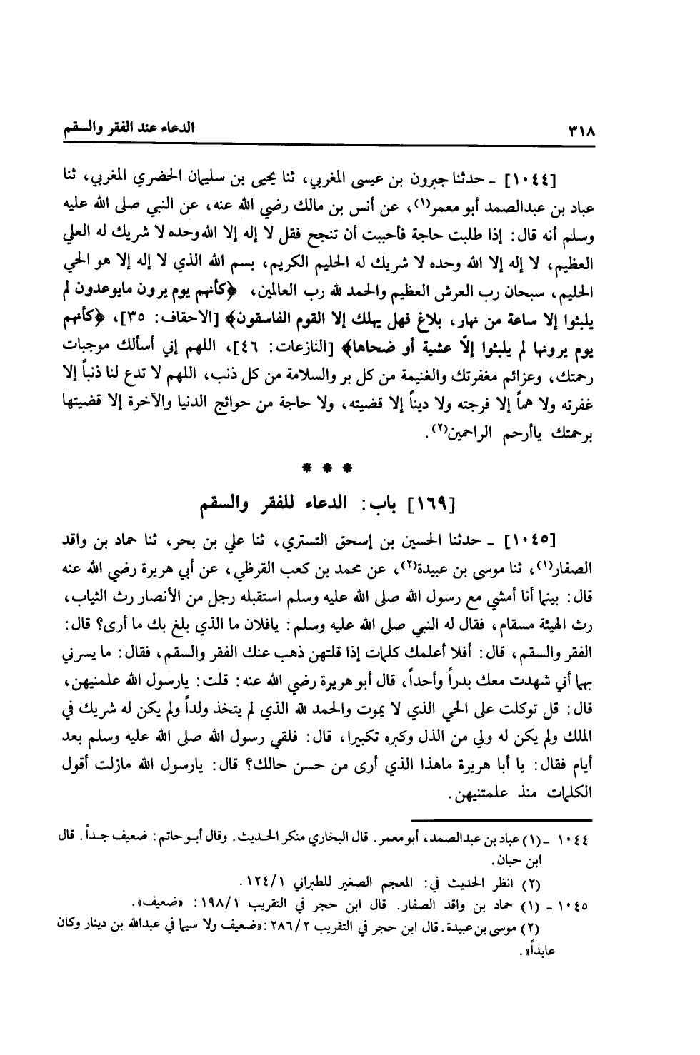 1044 - حَدَّثَنَا جَبْرُونُ بْنُ عِيسَى الْمَغْرِبِيُّ، ثنا يَحْيَى بْنُ سُلَيْمَانَ الْحَضَرِيُّ الْمَغْرِبِيُّ، ثنا عَبَّادُ بْنُ عَبْدِ الصَّمَدِ أَبُو مَعْمَرٍ، عَنْ أَنَسِ بْنِ مَالِكٍ، رَضِيَ اللَّهُ عَنْهُ عَنِ النَّبِيِّ صَلَّى اللهُ عَلَيْهِ وَسَلَّمَ أَنَّهُ قَالَ: " §إِذَا طَلَبْتَ حَاجَةً فَأَحْبَبْتَ أَنْ تَنْجَحَ فَقُلْ: لَا إِلَهَ إِلَّا اللَّهُ وَحْدَهُ لَا شَرِيكَ لَهُ الْعَلِيُّ الْعَظِيمُ، لَا إِلَهَ إِلَّا اللَّهُ وَحْدَهُ لَا شَرِيكَ لَهُ الْحَلِيمُ الْكَرِيمُ، بِسْمِ اللَّهِ الَّذِي لَا إِلَهَ إِلَّا هُوَ الْحَيُّ الْحَلِيمُ، سُبْحَانَ رَبِّ الْعَرْشِ الْعَظِيمِ، وَالْحَمْدُ لِلَّهِ رَبِّ الْعَالَمِينَ {كَأَنَّهُمْ يَوْمَ يَرَوْنَ مَا يُوعَدُونَ لَمْ يَلْبَثُوا} [الأحقاف: 35] إِلَّا سَاعَةً مِنْ نَهَارً بَلَاغٌ فَهَلْ يُهْلَكُ إِلَّا الْقَوْمُ الْفَاسِقُونَ {كَأَنَّهُمْ يَوْمَ يَرَوْنَهَا لَمْ يَلْبَثُوا إِلَّا عَشِيَّةً أَوْ ضُحَاهَا} [النازعات: 46] اللَّهُمَّ إِنِّي أَسْأَلُكَ مُوجِبَاتِ رَحْمَتِكَ، وَعَزَائِمَ مَغْفِرَتِكَ، وَالْغَنِيمَةَ مِنْ كُلِّ بِرٍّ، وَالسَّلَامَةَ مِنْ كُلِّ ذَنْبٍ، اللَّهُمَّ لَا تَدَعْ لَنَا ذَنْبًا إِلَّا غَفَرْتَهُ، وَلَا هَمًّا إِلَّا فَرَّجْتَهُ، وَلَا دَيْنًا إِلَّا قَضَيْتَهُ، وَلَا حَاجَةً مِنْ حَوَائِجِ الدُّنْيَا وَالْآخِرَةِ إِلَّا قَضَيْتَهَا بِرَحْمَتِكَ يَا أَرْحَمَ الرَّاحِمِينَ "