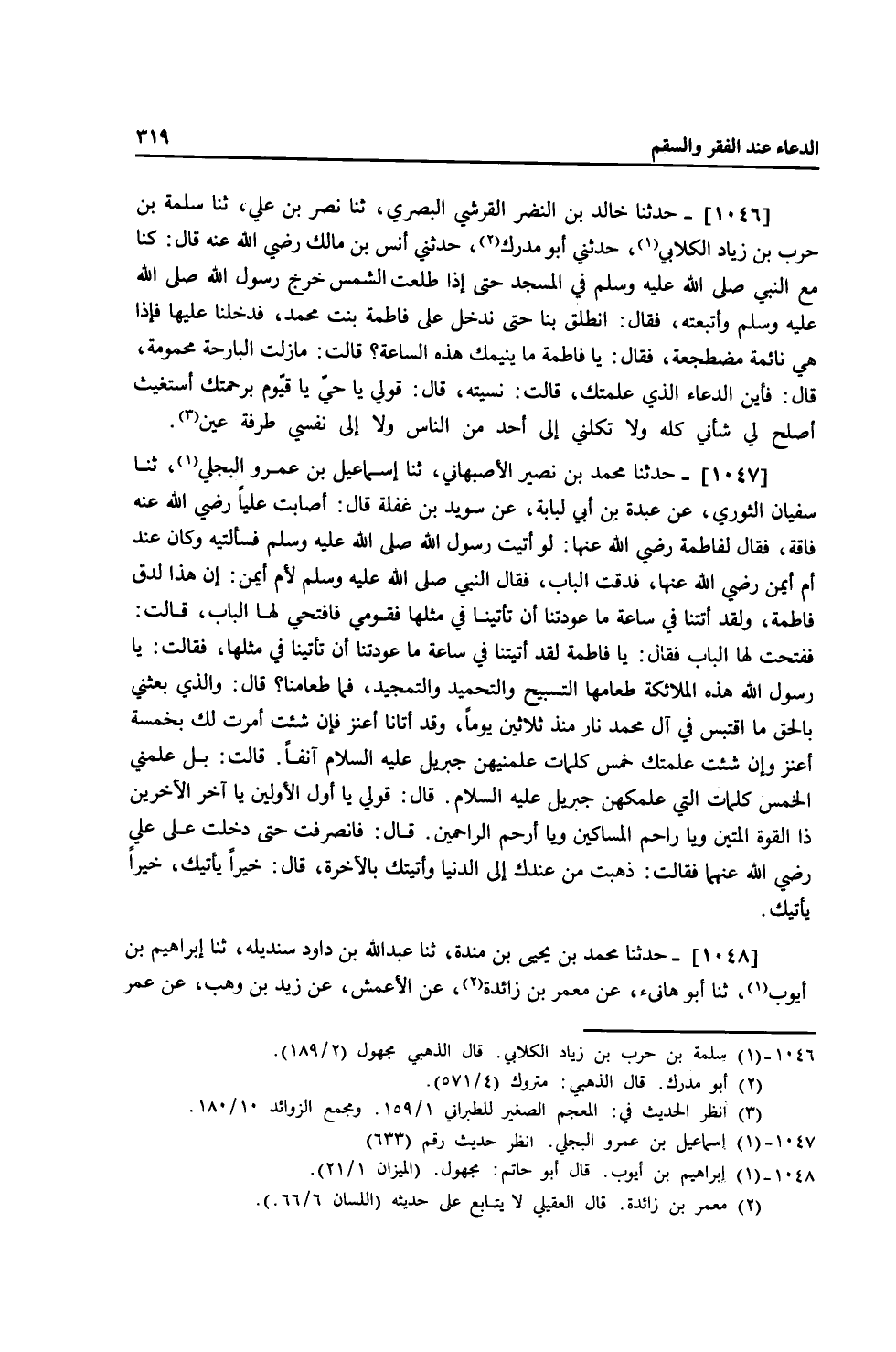 1046 - حَدَّثَنَا خَالِدُ بْنُ النَّضْرِ الْقُرَشِي الْبَصْرِيُّ، ثنا نَصْرُ بْنُ عَلِيٍّ، ثنا سَلَمَةُ بْنُ حَرْبِ بْنِ زِيَادٍ الْكِلَابِيُّ، حَدَّثَنِي أَبُو مُدْرِكٍ، حَدَّثَنِي أَنَسُ بْنُ مَالِكٍ، رَضِيَ اللَّهُ عَنْهُ قَالَ: كُنَّا مَعَ النَّبِيِّ صَلَّى اللهُ عَلَيْهِ وَسَلَّمَ فِي الْمَسْجِدِ حَتَّى إِذَا طَلَعَتِ الشَّمْسُ خَرَجَ رَسُولُ اللَّهِ صَلَّى اللهُ عَلَيْهِ وَسَلَّمَ وَاتَّبَعْتُهُ، فَقَالَ: انْطَلِقْ بِنَا حَتَّى نَدْخُلَ عَلَى فَاطِمَةَ بِنْتِ مُحَمَّدٍ، فَدَخَلْنَا عَلَيْهَا فَإِذَا هِيَ نَائِمَةٌ مُضْطَجِعَةٌ، فَقَالَ: «يَا فَاطِمَةُ مَا يُنِيمُكِ هَذِهِ السَّاعَةِ؟» قَالَتْ: مَا زِلْتُ الْبَارِحَةَ مَحْمُومَةً، قَالَ: «فَأَيْنَ الدُّعَاءُ الَّذِي عَلَّمْتُكِ؟» قَالَتْ: نَسِيتُهُ، قَالَ: " §قُولِي: يَا حَيُّ يَا قَيُّومُ بِرَحْمَتِكَ أَسْتَغِيثُ أَصْلِحْ لِي شَأْنِي كُلَّهُ، وَلَا تَكِلْنِي إِلَى أَحَدٍ مِنَ النَّاسِ وَلَا إِلَى نَفْسِي طَرْفَةَ عَيْنٍ "