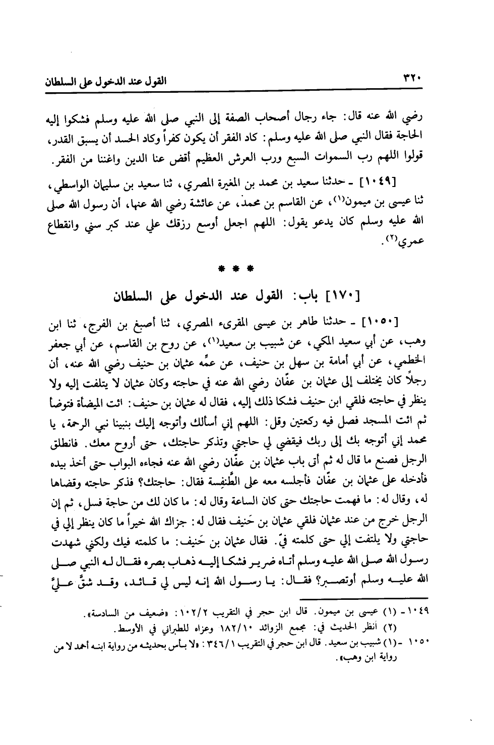 1050 - حَدَّثَنَا طَاهِرُ بْنُ عِيسَى الْمُقْرِئُ الْمِصْرِيُّ، ثنا أَصْبَغُ بْنُ الْفَرَجِ، ثنا ابْنُ وَهْبٍ، عَنْ أَبِي سَعِيدٍ الْمَكِّيِّ، عَنْ شَبِيبِ بْنِ سَعِيدٍ، عَنْ رَوْحِ بْنِ الْقَاسِمِ، عَنْ أَبِي جَعْفَرٍ الْخَطْمِيِّ، عَنْ أَبِي أُمَامَةَ بْنِ سَهْلِ بْنِ حُنَيْفٍ، عَنْ عَمِّهِ عُثْمَانَ بْنِ حُنَيْفٍ رَضِيَ اللَّهُ عَنْهُ أَنَّ رَجُلًا كَانَ يَخْتَلِفُ إِلَى عُثْمَانَ بْنِ عَفَّانَ رَضِيَ اللَّهُ عَنْهُ فِي حَاجَتِهِ وَكَانَ عُثْمَانُ لَا يَلْتَفِتُ إِلَيْهِ وَلَا يَنْظُرُ فِي حَاجَتِهِ، فَلَقِيَ ابْنَ حُنَيْفٍ فَشَكَا ذَلِكَ إِلَيْهِ، فَقَالَ لَهُ عُثْمَانُ بْنُ حُنَيْفٍ: ائْتِ الْمِيضَأَةَ فَتَوَضَّأْ، ثُمَّ ائْتِ الْمَسْجِدَ، فَصَلِّ فِيهِ رَكْعَتَيْنِ وَقُلِ: " §اللَّهُمَّ إِنِّي أَسْأَلُكَ وَأَتَوَجَّهُ إِلَيْكَ بِنَبِيِّنَا نَبِيِّ الرَّحْمَةِ: يَا مُحَمَّدُ إِنِّي أَتَوَجَّهُ بِكَ إِلَى رَبِّكَ فَيَقْضِي لِي حَاجَتِي، وَتُذْكُرُ حَاجَتَكَ " حَتَّى أَرْوَحَ مَعَكَ، فَانْطَلَقَ الرَّجُلُ فَصَنَعَ مَا قَالَ لَهُ، ثُمَّ أَتَى بَابَ عُثْمَانَ بْنِ عَفَّانَ رَضِيَ اللَّهُ عَنْهُ فَجَاءَهُ الْبَوَّابُ حَتَّى أَخَذَ بِيَدِهِ فَأَدْخَلَهُ عَلَى عُثْمَانَ بْنِ عَفَّانَ فَأَجْلَسَهُ مَعَهُ عَلَى الطِّنْفِسَةِ فَقَالَ: حَاجَتُكَ؟ فَذَكَرَ حَاجَتَهُ وَقَضَاهَا لَهُ، وَقَالَ لَهُ: مَا فَهِمْتَ حَاجَتَكَ حَتَّى كَانَ السَّاعَةُ، وَقَالَ لَهُ: مَا كَانَ لَكَ مِنْ حَاجَةٍ فَسَلْ، ثُمَّ إِنَّ الرَّجُلَ خَرَجَ مِنْ عِنْدِ عُثْمَانَ فَلَقِيَ عُثْمَانَ بْنَ حُنَيْفٍ فَقَالَ لَهُ جَزَاكَ اللَّهُ خَيْرًا مَا كَانَ يَنْظُرُ إِلَيَّ فِي حَاجَتِي وَلَا يَلْتَفِتُ إِلَيَّ حَتَّى كَلَّمْتُهُ فِي، فَقَالَ عُثْمَانُ بْنُ حُنَيْفٍ: مَا كَلِمَتُهُ فِيكَ، وَلَكِنِّي شَهِدْتُ رَسُولَ اللَّهِ صَلَّى اللهُ عَلَيْهِ وَسَلَّمَ أَتَاهُ ضَرِيرٌ فَشَكَا إِلَيْهِ ذَهَابَ بَصَرِهِ فَقَالَ لَهُ النَّبِيُّ صَلَّى اللهُ عَلَيْهِ وَسَلَّمَ: «أَوَتَصْبِرُ؟» فَقَالَ: يَا رَسُولَ اللَّهِ إِنَّهُ لَيْسَ لِي قَائِدٌ وَقَدْ شَقَّ عَلَيَّ -[321]- فَقَالَ لَهُ النَّبِيُّ: «ائْتِ الْمِيضَأَةَ فَتَوَضَّأْ، ثُمَّ صَلِّ رَكْعَتَيْنِ، ثُمَّ ادْعُ بِهَذِهِ الدَّعَوَاتِ» قَالَ ابْنُ حُنَيْفٍ: وَاللَّهِ مَا تَفَرَّقْنَا حَتَّى دَخَلَ عَلَيْنَا الرَّجُلُ كَأَنَّهُ لَمْ يَكُنْ بِهِ ضَرَرٌ قَطُّ قَالَ الطَّبَرَانِيُّ رَحِمَهُ اللَّهُ: خَالَفَ شُعْبَةُ رَوْحَ بْنَ الْقَاسِمِ فِي إِسْنَادِ هَذَا الْحَدِيثِ فَرَوَاهُ عَنُ أَبِي جَعْفَرٍ الْخَطْمِيِّ عَنْ عُمَارَةَ بْنِ خُزَيْمَةَ بْنِ ثَابِتٍ عَنْ عُثْمَانَ بْنِ حُنَيْفٍ رَضِيَ اللَّهُ عَنْهُ