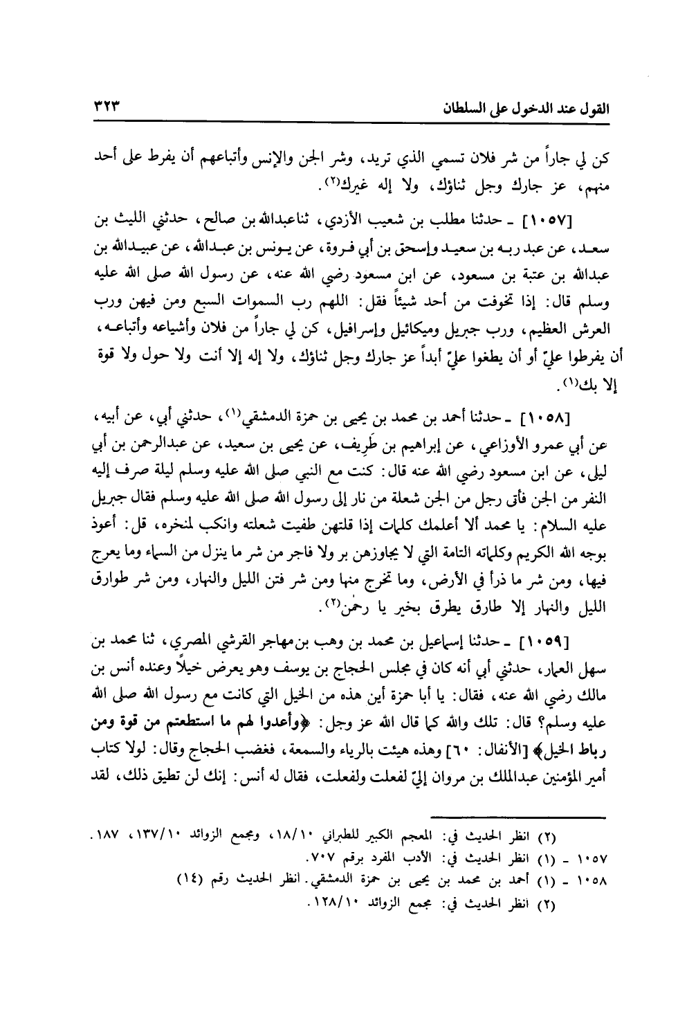 1058 - حَدَّثَنَا أَحْمَدُ بْنُ مُحَمَّدِ بْنِ يَحْيَى بْنِ حَمْزَةَ الدِّمَشْقِيُّ، حَدَّثَنِي أَبِي، عَنْ أَبِيهِ، عَنْ أَبِي عَمْرٍو الْأَوْزَاعِيِّ، عَنْ إِبْرَاهِيمَ بْنِ طَرِيفٍ، عَنْ يَحْيَى بْنِ سَعِيدٍ، عَنْ عَبْدِ الرَّحْمَنِ بْنِ أَبِي لَيْلَى، عَنِ ابْنِ مَسْعُودٍ، رَضِيَ اللَّهُ عَنْهُ قَالَ: كُنْتُ مَعَ النَّبِيِّ صَلَّى اللهُ عَلَيْهِ وَسَلَّمَ لَيْلَةَ صُرِفَ إِلَيْهِ النَّفَرُ مِنَ الْجِنِّ فَأَتَى رَجُلٌ مِنَ الْجِنِّ شُعْلَةً مِنْ نَارٍ إِلَى رَسُولِ اللَّهِ صَلَّى اللهُ عَلَيْهِ وَسَلَّمَ فَقَالَ جِبْرِيلُ عَلَيْهِ السَّلَامُ: " يَا مُحَمَّدُ أَلَا أُعَلِّمُكَ كَلِمَاتٍ إِذَا قُلْتَهُنَّ طُفِيَتْ شُعْلَتُهُ وَانْكَبَّ لِمِنْخَرِهِ، قُلْ: §أَعُوذُ بِوَجْهِ اللَّهِ الْكَرِيمِ وَكَلِمَاتِهِ التَّامَّةِ الَّتِي لَا يُجَاوِزُهُنَّ بَرٌّ وَلَا فَاجِرٌ مِنْ شَرِّ مَا يَنْزِلُ مِنَ السَّمَاءِ، وَمَا يَعْرُجُ فِيهَا، وَمِنْ شَرِّ مَا ذَرَأَ فِي الْأَرْضِ، وَمَا تَخْرُجُ مِنْهَا، وَمِنْ شَرِّ فِتَنِ اللَّيْلِ وَالنَّهَارِ، وَمِنْ شَرِّ طَوَارِقِ اللَّيْلِ وَالنَّهَارِ إِلَّا طَارِقٍ يَطْرُقُ بِخَيْرٍ يَا رَحْمَنُ "