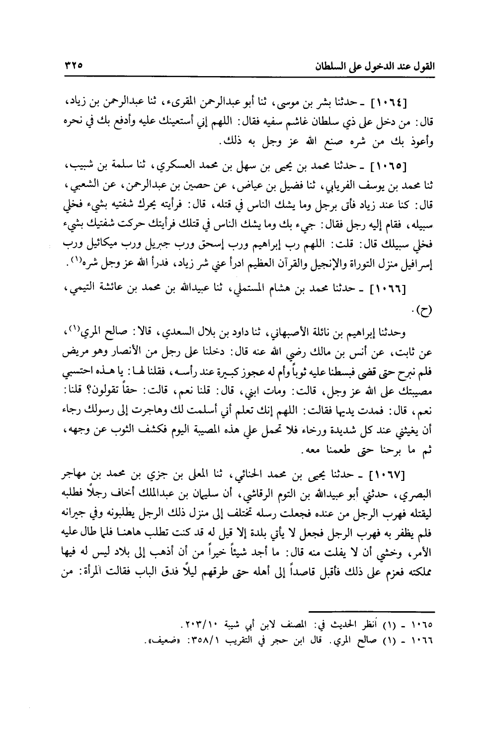 1064 - حَدَّثَنَا بِشْرُ بْنُ مُوسَى، ثنا أَبُو عَبْدِ الرَّحْمَنِ الْمُقْرِئُ، ثنا عَبْدُ الرَّحْمَنِ بْنُ زِيَادٍ، قَالَ: " §مَنْ دَخَلَ عَلَى ذِي سُلْطَانٍ غَاشِمٍ سَفِيهٍ فَقَالَ: اللَّهُمَّ إِنِّي أَسْتَعِينُكَ عَلَيْهِ، وَأَدْفَعُ بِكَ فِي نَحْرِهِ، وَأَعُوذُ بِكَ مِنْ شَرِّهِ، صَنَعَ اللَّهُ عَزَّ وَجَلَّ بِهِ ذَلِكَ "