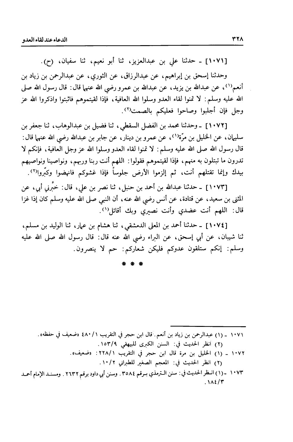 1071 - حَدَّثَنَا عَلِيُّ بْنُ عَبْدِ الْعَزِيزِ، ثنا أَبُو نُعَيْمٍ، ثنا سُفْيَانُ، ح وَحَدَّثَنَا إِسْحَاقُ بْنُ إِبْرَاهِيمَ، عَنْ عَبْدِ الرَّزَّاقِ، عَنِ الثَّوْرِيِّ، عَنْ عَبْدِ الرَّحْمَنِ بْنِ زِيَادِ بْنِ أَنْعَمَ، عَنْ عَبْدِ اللَّهِ بْنِ يَزِيدَ، عَنْ عَبْدِ اللَّهِ بْنِ عَمْرٍو، رَضِيَ اللَّهُ عَنْهُمَا قَالَ: قَالَ رَسُولُ اللَّهِ صَلَّى اللهُ عَلَيْهِ وَسَلَّمَ: «§لَا تَمَنَّوْا لِقَاءَ الْعَدُوِّ، وَسَلُوا اللَّهَ الْعَافِيَةَ، فَإِذَا لَقِيتُمُوهُمْ فَاثْبُتُوا، وَاذْكُرُوا اللَّهَ عَزَّ وَجَلَّ فَإِنْ أَجْلَبُوا وَصَاحُوا فَعَلَيْكُمْ بِالصَّمْتِ»