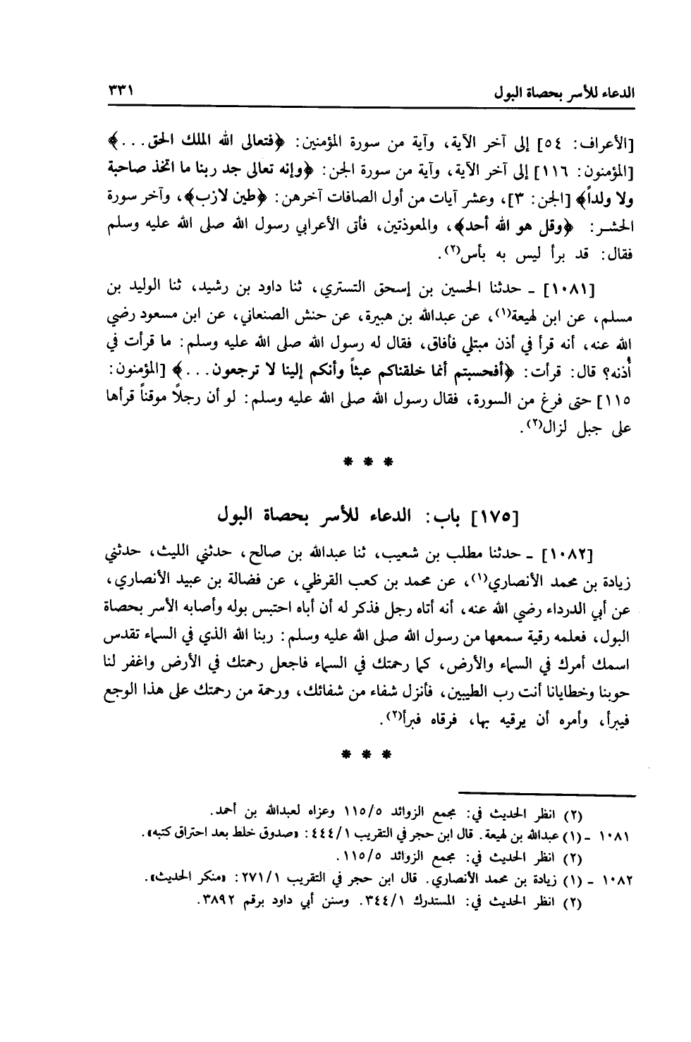 1081 - حَدَّثَنَا الْحُسَيْنُ بْنُ إِسْحَاقَ التُّسْتَرِيُّ، ثنا دَاوُدُ بْنُ رُشَيْدٍ، ثنا الْوَلِيدُ بْنُ مُسْلِمٍ، عَنِ ابْنِ لَهِيعَةَ، عَنْ عَبْدِ اللَّهِ بْنِ هُبَيْرَةَ، عَنْ حَنَشٍ الصَّنْعَانِيِّ، عَنِ ابْنِ مَسْعُودٍ، رَضِيَ اللَّهُ عَنْهُ أَنَّهُ قَرَأَ فِي أُذُنِ مُبْتَلًى فَأَفَاقَ فَقَالَ لَهُ رَسُولُ اللَّهِ صَلَّى اللهُ عَلَيْهِ وَسَلَّمَ: «مَا قَرَأْتَ فِي أُذُنِهِ؟» قَالَ: قَرَأْتُ {أَفَحَسِبْتُمْ أَنَّمَا خَلَقْنَاكُمْ عَبَثًا وَأَنَّكُمْ إِلَيْنَا لَا تُرْجَعُونَ} [المؤمنون: 115] حَتَّى فَرَغَ مِنَ السُّورَةِ فَقَالَ رَسُولُ اللَّهِ صَلَّى اللهُ عَلَيْهِ وَسَلَّمَ: «§لَوْ أَنَّ رَجُلًا مُوقِنًا قَرَأَهَا عَلَى جَبَلٍ لَزَالَ»