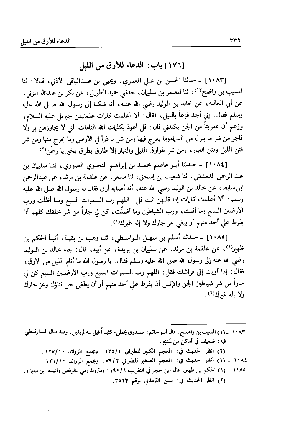 1083 - حَدَّثَنَا الْحَسَنُ بْنُ عَلِيٍّ الْمَعْمَرِيُّ، وَيَحْيَى بْنُ عَبْدِ الْبَاقِي الْأَذَنِيُّ، قَالَا: ثنا الْمُسَيَّبُ بْنُ وَاضِحٍ، ثنا الْمُعْتَمِرُ بْنُ سُلَيْمَانَ، حَدَّثَنِي حُمَيْدٌ الطَّوِيلُ، عَنْ بَكْرِ بْنِ عَبْدِ اللَّهِ الْمُزَنِيِّ، عَنْ أَبِي الْعَالِيَةِ، عَنْ خَالِدِ بْنِ الْوَلِيدِ، رَضِيَ اللَّهُ عَنْهُ أَنَّهُ شَكَا إِلَى رَسُولِ اللَّهِ صَلَّى اللهُ عَلَيْهِ وَسَلَّمَ فَقَالَ: إِنِّي أَجِدُ فَزَعًا بِاللَّيْلِ، فَقَالَ: «أَلَا أُعَلِّمُكَ كَلِمَاتٍ عَلَّمَنِيهِنَّ جِبْرِيلُ عَلَيْهِ السَّلَامُ، وَزَعَمَ أَنَّ عِفْرِيتًا مِنَ الْجِنِّ يَكِيدُنِي؟» قَالَ: «قُلْ §أَعُوذُ بِكَلِمَاتِ اللَّهِ التَّامَّاتِ الَّتِي لَا يُجَاوِزُهُنَّ بَرٌّ وَلَا فَاجِرٌ مِنْ شَرِّ مَا يَنْزِلُ مِنَ السَّمَاءِ وَمَا يَعْرُجُ فِيهَا وَمِنْ شَرِّ مَا ذَرَأَ فِي الْأَرْضِ وَمَا يَخْرُجُ مِنْهَا وَمِنْ شَرِّ فِتَنِ اللَّيْلِ وَفِتَنِ النَّهَارِ، وَمِنْ شَرِّ طَوَارِقِ اللَّيْلِ وَالنَّهَارِ إِلَّا طَارِقٍ يَطْرُقُ بِخَيْرٍ يَا رَحْمَنُ»