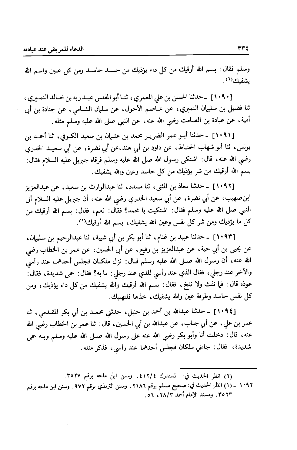 1093 - حَدَّثَنَا عُبَيْدُ بْنُ غَنَّامٍ، ثنا أَبُو بَكْرِ بْنُ أَبِي شَيْبَةَ، ثنا عَبْدُ الرَّحِيمِ بْنُ سُلَيْمَانَ، عَنْ يَحْيَى بْنِ أَبِي حَيَّةَ، عَنْ عَبْدِ الْعَزِيزِ بْنِ رُفَيْعٍ، عَنْ أَبِي الْحُسَيْنِ، عَنْ عُمَرَ بْنِ الْخَطَّابِ، رَضِيَ اللَّهُ عَنْهُ أَنَّ رَسُولَ اللَّهِ صَلَّى اللهُ عَلَيْهِ وَسَلَّمَ قَالَ: " §نَزَلَ مَلَكَانِ فَجَلَسَ أَحَدُهُمَا عِنْدَ رَأْسِي وَالْآخَرُ عِنْدَ رِجْلَيَّ، فَقَالَ الَّذِي عِنْدَ رَأْسِي لِلَّذِي عِنْدَ رِجْلَيَّ: مَا بِهِ؟ فَقَالَ: حُمَّى شَدِيدَةٌ، فَقَالَ: عَوِّذْهُ، قَالَ: فَمَا نَفَثَ وَلَا نَفَخَ، فَقَالَ: بِسْمِ اللَّهِ أَرْقِيكَ، وَاللَّهُ يَشْفِيكَ، مِنْ كُلِّ دَاءٍ يُؤْذِيكَ، وَمِنْ كُلِّ نَفْسِ حَاسِدٍ، وَطَرْفَةِ عَيْنٍ، وَاللَّهُ يَشْفِيكَ خُذْهَا فَلْتُهَنِّيكَ "