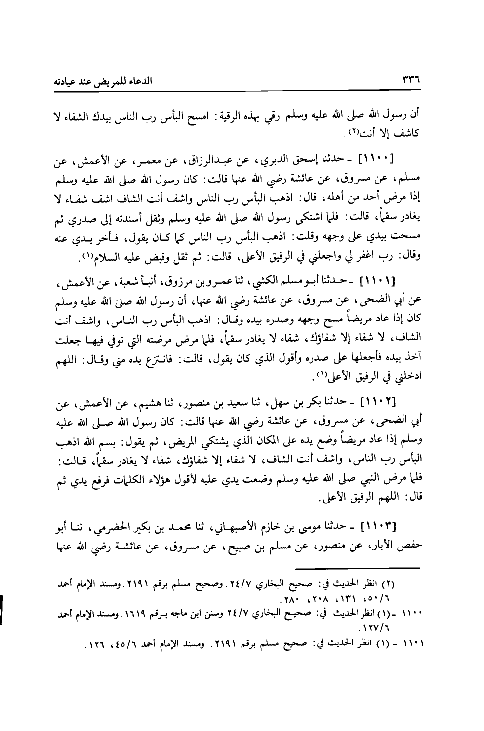 1102 - حَدَّثَنَا بَكْرُ بْنُ سَهْلٍ، ثنا سَعِيدُ بْنُ مَنْصُورٍ، ثنا هُشَيْمٌ، عَنِ الْأَعْمَشِ، عَنْ أَبِي الضُّحَى، عَنْ مَسْرُوقٍ، عَنْ عَائِشَةَ، رَضِيَ اللَّهُ عَنْهَا قَالَتْ: كَانَ رَسُولُ اللَّهِ صَلَّى اللهُ عَلَيْهِ وَسَلَّمَ إِذَا عَادَ مَرِيضًا وَضَعَ يَدَهُ عَلَى الْمَكَانِ الَّذِي يَشْتَكِي الْمَرِيضُ ثُمَّ يَقُولُ: «§بِسْمِ اللَّهِ أَذْهِبِ الْبَأْسَ رَبَّ النَّاسِ، وَاشْفِ أَنْتَ الشَّافِ لَا شِفَاءَ إِلَّا شِفَاؤُكَ شِفَاءً لَا يُغَادِرُ سَقَمًا» قَالَتْ: فَلَمَّا مَرِضَ النَّبِيُّ صَلَّى اللهُ عَلَيْهِ وَسَلَّمَ وَضَعْتُ يَدِي عَلَيْهِ لَأَقُولَ هَؤُلَاءِ الْكَلِمَاتِ، فَرَفَعَ يَدِي ثُمَّ قَالَ: «اللَّهُمَّ الرَّفِيقَ الْأَعْلَى»