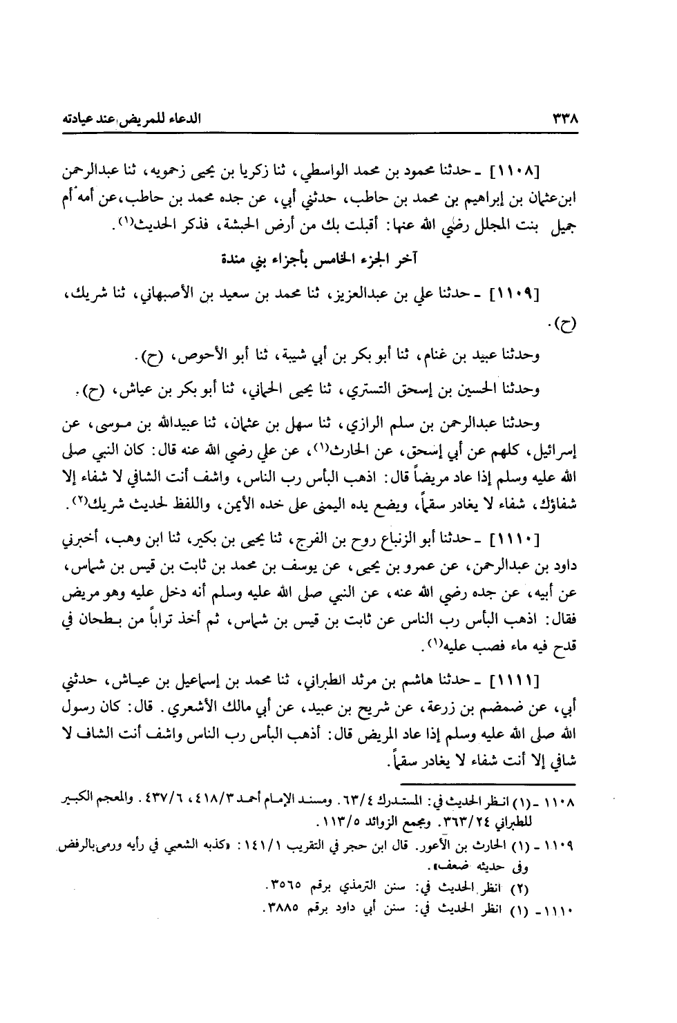 1109 - حَدَّثَنَا عَلِيُّ بْنُ عَبْدِ الْعَزِيزِ، ثنا مُحَمَّدُ بْنُ سَعِيدِ بْنِ الْأَصْبَهَانِيِّ، ثنا شَرِيكٌ، ح وَحَدَّثَنَا عُبَيْدُ بْنُ غَنَّامٍ، ثنا أَبُو بَكْرِ بْنُ أَبِي شَيْبَةَ، ثنا أَبُو الْأَحْوَصِ، ح وَحَدَّثَنَا الْحُسَيْنُ بْنُ إِسْحَاقَ التُّسْتَرِيُّ، ثنا يَحْيَى الْحِمَّانِيُّ، ثنا أَبُو بَكْرِ بْنُ عَيَّاشٍ، ح وَحَدَّثَنَا عَبْدُ الرَّحْمَنِ بْنُ سَلْمٍ الرَّازِيُّ، ثنا سَهْلُ بْنُ عُثْمَانَ، ثنا عُبَيْدُ اللَّهِ بْنُ مُوسَى، عَنْ إِسْرَائِيلَ، كُلُّهُمْ عَنْ أَبِي إِسْحَاقَ، عَنِ الْحَارِثِ، عَنْ عَلِيٍّ، رَضِيَ اللَّهُ عَنْهُ قَالَ: كَانَ النَّبِيُّ صَلَّى اللهُ عَلَيْهِ وَسَلَّمَ إِذَا عَادَ مَرِيضًا قَالَ: «§أَذْهِبِ الْبَأْسَ رَبَّ النَّاسِ، وَاشْفِ أَنْتَ الشَّافِي، لَا شِفَاءَ إِلَّا شِفَاؤُكَ شِفَاءً لَا يُغَادِرُ سَقَمًا» وَيَضَعُ يَدَهُ الْيُمْنَى عَلَى خَدِّهِ الْأَيْمَنِ وَاللَّفْظُ لِحَدِيثِ شَرِيكٍ