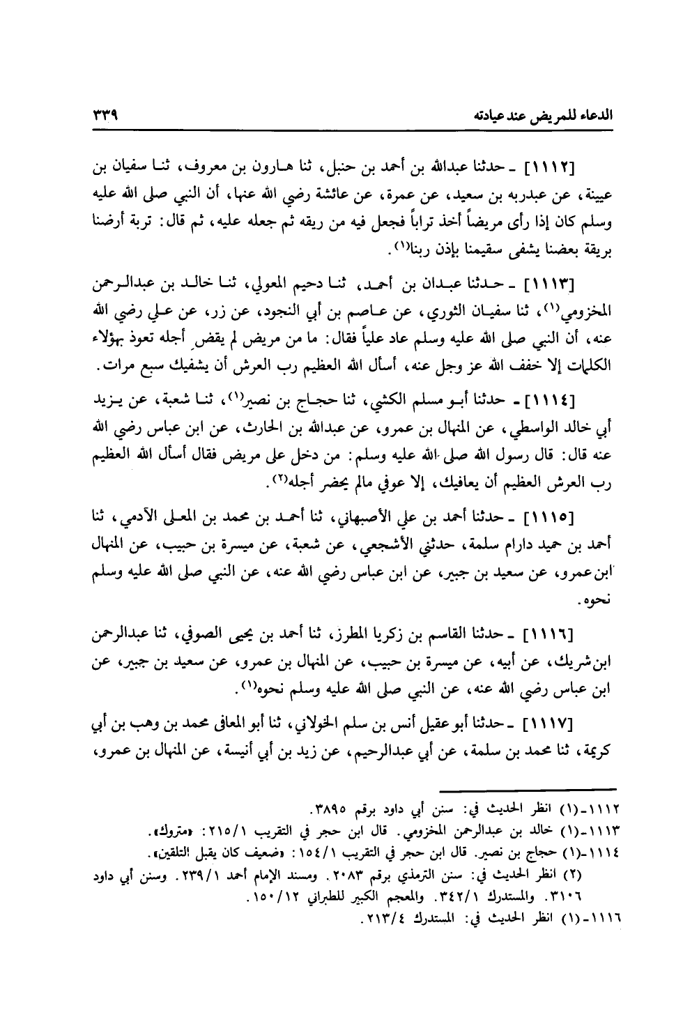 1117 - حَدَّثَنَا أَبُو عَقِيلٍ أَنَسُ بْنُ سَلْمٍ الْخَوْلَانِيُّ، ثنا أَبُو الْمُعَافَى مُحَمَّدُ بْنُ وَهْبِ بْنِ أَبِي كَرِيمَةَ، ثنا مُحَمَّدُ بْنُ سَلَمَةَ، عَنْ أَبِي عَبْدِ الرَّحِيمِ، عَنْ زَيْدِ بْنِ أَبِي أُنَيْسَةَ، عَنِ الْمِنْهَالِ بْنِ عَمْرٍو، عَنْ سَعِيدِ بْنِ جُبَيْرٍ، عَنِ ابْنِ عَبَّاسٍ، رَضِيَ اللَّهُ عَنْهُ قَالَ: قَالَ نَبِيُّ اللَّهِ صَلَّى اللهُ عَلَيْهِ وَسَلَّمَ: «§مَا مِنْ رَجُلٍ يَعُودُ مَرِيضًا فَيَقُولُ أَسْأَلُ اللَّهَ الْعَظِيمَ رَبَّ الْعَرْشِ الْعَظِيمِ أَنْ يَشْفِيَكَ سَبْعَ مَرَّاتٍ وَفِي أَجَلِهِ تَأْخِيرٌ إِلَّا خَفَّفَ عَنْهُ»