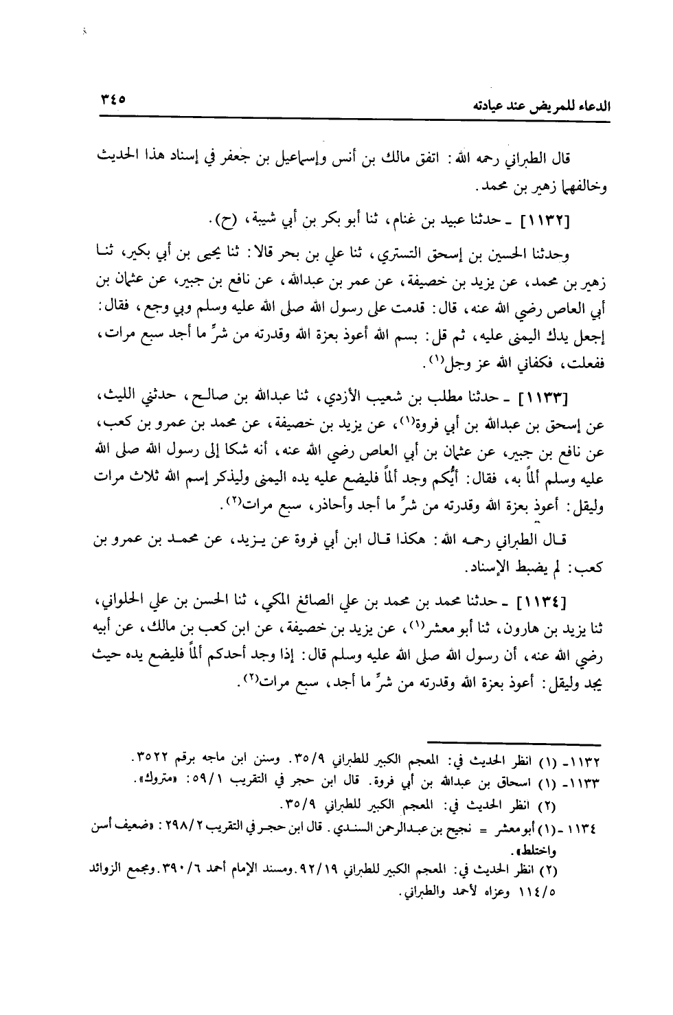 1133 - حَدَّثَنَا مُطَّلِبُ بْنُ شُعَيْبٍ الْأَزْدِيُّ، ثنا عَبْدُ اللَّهِ بْنُ صَالِحٍ، حَدَّثَنِي اللَّيْثُ، عَنْ إِسْحَاقَ بْنِ عَبْدِ اللَّهِ بْنِ أَبِي فَرْوَةَ، عَنْ يَزِيدَ بْنِ خُصَيْفَةَ، عَنْ مُحَمَّدِ بْنِ عَمْرِو بْنِ كَعْبٍ، عَنْ نَافِعِ بْنِ جُبَيْرٍ، عَنْ عُثْمَانَ بْنِ أَبِي الْعَاصِ، رَضِيَ اللَّهُ عَنْهُ أَنَّهُ شَكَا إِلَى رَسُولِ اللَّهِ صَلَّى اللهُ عَلَيْهِ وَسَلَّمَ أَلَمًا بِهِ فَقَالَ: " §أَيُّكُمْ وَجَدَ أَلَمًا فَلْيَضَعْ عَلَيْهِ يَدَهُ الْيُمْنَى وَلْيَذْكُرِ اسْمَ اللَّهِ ثَلَاثَ مَرَّاتٍ وَلْيَقُلْ: أَعُوذُ بِعِزَّةِ اللَّهِ وَقُدْرَتِهِ مِنْ شَرِّ مَا أَجِدُ وَأُحَاذِرُ سَبْعَ مَرَّاتٍ " قَالَ الطَّبَرَانِيُّ رَحِمَهُ اللَّهُ: هَكَذَا قَالَ ابْنُ أَبِي فَرْوَةَ عَنْ يَزِيدَ عَنْ مُحَمَّدِ بْنِ عَمْرِو بْنِ كَعْبٍ لَمْ يَضْبِطِ الْإِسْنَادَ