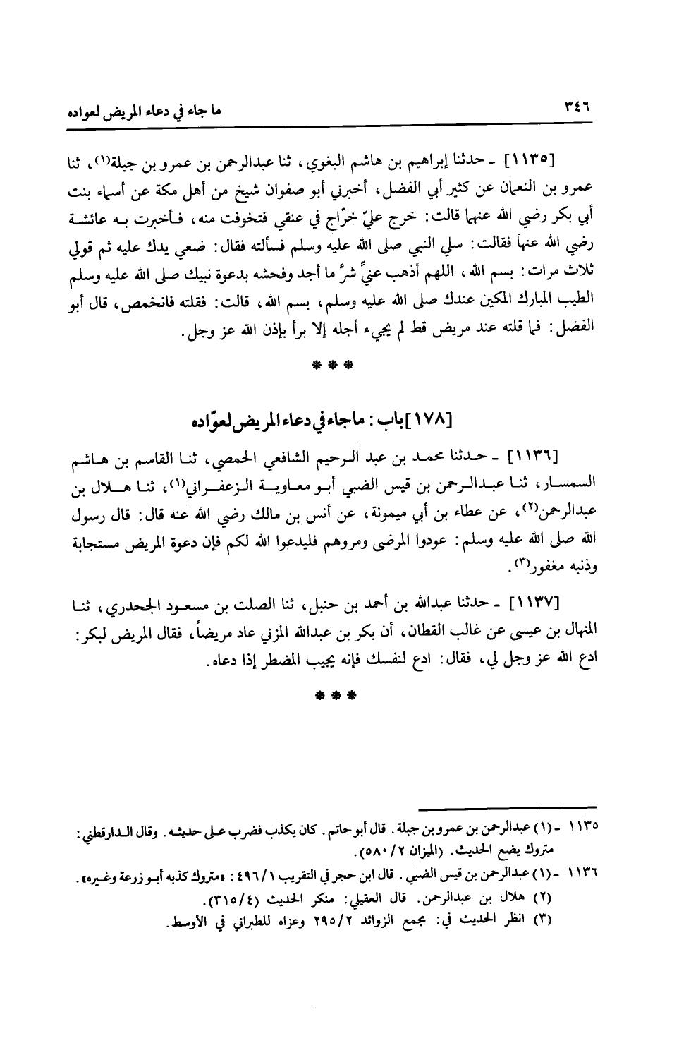 1136 - حَدَّثَنَا مُحَمَّدُ بْنُ عَبْدِ الرَّحِيمِ الشَّافِعِيُّ الْحِمْصِيُّ، ثنا الْقَاسِمُ بْنُ هَاشِمٍ السِّمْسَارُ، ثنا عَبْدُ الرَّحْمَنِ بْنُ قَيْسٍ الضَّبِّيُّ أَبُو مُعَاوِيَةَ الزَّعْفَرَانِيُّ، ثنا هِلَالُ بْنُ عَبْدِ الرَّحْمَنِ، عَنْ عَطَاءِ بْنِ أَبِي مَيْمُونَةَ، عَنْ أَنَسِ بْنِ مَالِكٍ، رَضِيَ اللَّهُ عَنْهُ قَالَ: قَالَ رَسُولُ اللَّهِ صَلَّى اللهُ عَلَيْهِ وَسَلَّمَ: «§عُودُوا الْمَرْضَى وَمُرُوهُمْ فَلْيَدْعُوا لَكُمْ، فَإِنَّ دَعْوَةَ الْمَرِيضِ مُسْتَجَابَةٌ وَذَنْبَهُ مَغْفُورٌ»