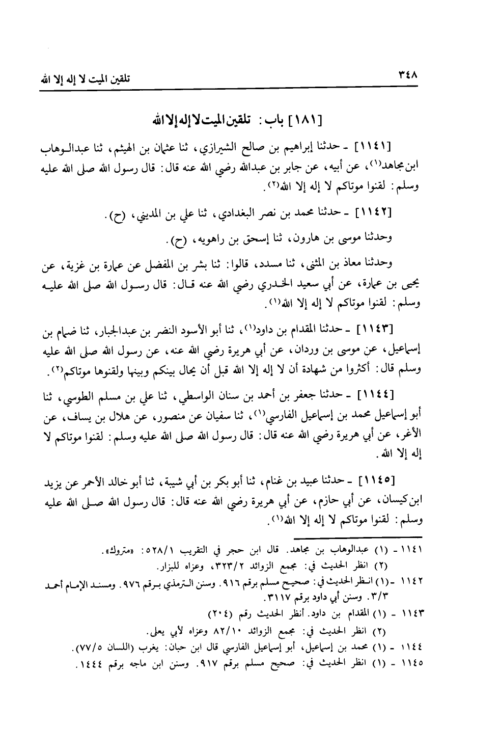 1142 - حَدَّثَنَا مُحَمَّدُ بْنُ نَصْرٍ الْبَغْدَادِيُّ، ثنا عَلِيُّ بْنُ الْمَدِينِيِّ، ح وَحَدَّثَنَا مُوسَى بْنُ هَارُونَ، ثنا إِسْحَاقُ بْنُ رَاهَوَيْهِ، ح وَحَدَّثَنَا مُعَاذُ بْنُ الْمُثَنَّى، ثنا مُسَدَّدٌ، قَالُوا: ثنا بِشْرُ بْنُ الْمُفَضَّلِ، عَنْ عُمَارَةَ بْنِ غَزِيَّةَ، عَنْ يَحْيَى بْنِ عُمَارَةَ، عَنْ أَبِي سَعِيدٍ الْخُدْرِيِّ، رَضِيَ اللَّهُ عَنْهُ قَالَ: قَالَ رَسُولُ اللَّهِ صَلَّى اللهُ عَلَيْهِ وَسَلَّمَ: «§لَقِّنُوا مَوْتَاكُمْ لَا إِلَهَ إِلَّا اللَّهُ»