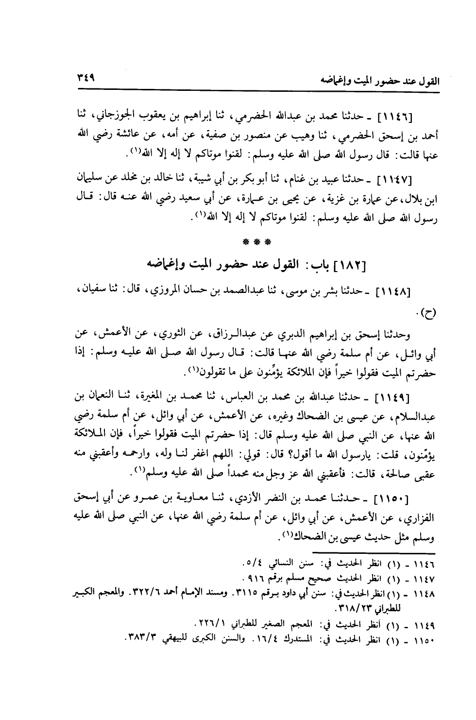 1149 - حَدَّثَنَا عَبْدُ اللَّهِ بْنُ مُحَمَّدِ بْنِ الْعَبَّاسِ، ثنا مُحَمَّدُ بْنُ الْمُغِيرَةِ، ثنا النُّعْمَانُ بْنُ عَبْدِ السَّلَامِ، عَنْ عِيسَى بْنِ الضَّحَّاكِ وَغَيْرِهِ، عَنِ الْأَعْمَشِ، عَنْ أَبِي وَائِلٍ، عَنْ أُمِّ سَلَمَةَ، رَضِيَ اللَّهُ عَنْهَا عَنِ النَّبِيِّ صَلَّى اللهُ عَلَيْهِ وَسَلَّمَ قَالَ: «§إِذَا حَضَرْتُمُ الْمَيِّتَ فَقُولُوا خَيْرًا فَإِنَّ الْمَلَائِكَةَ يُؤَمِّنُونَ» قُلْتُ: يَا رَسُولَ اللَّهِ مَا أَقُولُ؟ قَالَ: «قُولِي اللَّهُمَّ اغْفِرْ لَنَا وَلَهُ وَارْحَمْهُ، وَأَعْقِبْنِي مِنْهُ عُقْبَى صَالِحَةً» قَالَتْ: فَأَعْقَبَنِي اللَّهُ عَزَّ وَجَلَّ مِنْهُ مُحَمَّدًا صَلَّى اللهُ عَلَيْهِ وَسَلَّمَ