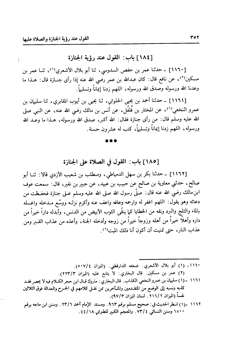 1162 - حَدَّثَنَا بَكْرُ بْنُ سَهْلٍ الدِّمْيَاطِيُّ، وَمُطَّلِبُ بْنُ شُعَيْبٍ الْأَزْدِيُّ، قَالَا: ثنا أَبُو صَالِحٍ، حَدَّثَنِي مُعَاوِيَةُ بْنُ صَالِحٍ، عَنْ حَبِيبِ بْنِ عُبَيْدٍ، عَنْ جُبَيْرِ بْنِ نُفَيْرٍ، قَالَ: سَمِعْتُ عَوْفَ بْنَ مَالِكٍ، رَضِيَ اللَّهُ عَنْهُ قَالَ: صَلَّى رَسُولُ اللَّهِ صَلَّى اللهُ عَلَيْهِ وَسَلَّمَ عَلَى جَنَازَةٍ فَحَفِظْتُ مِنْ دُعَائِهِ وَهُوَ يَقُولُ: «§اللَّهُمَّ اغْفِرْ لَهُ وَارْحَمْهُ، وَعَافِهِ وَاعْفُ عَنْهُ، وَأَكْرِمْ نُزُلَهُ، وَوَسِّعْ مُدْخَلَهُ، وَاغْسِلْهُ بِالْمَاءِ وَالثَّلْجِ وَالْبَرَدِ، وَنَقِّهِ مِنَ الْخَطَايَا كَمَا يُنَقَّى الثَّوْبُ الْأَبْيَضُ مِنَ الدَّنَسِ، وَأَبْدِلْهُ دَارًا خَيْرًا مِنْ دَارِهِ، وَأَهْلًا خَيْرًا مِنْ أَهْلِهِ، وَزَوْجًا خَيْرًا مِنْ زَوْجِهِ، وَأَدْخِلْهُ الْجَنَّةَ، وَأَعِذْهُ مِنْ عَذَابِ الْقَبْرِ، وَمِنْ عَذَابِ النَّارِ» حَتَّى تَمَنَّيْتُ أَنْ أَكُونَ أَنَا ذَلِكَ الْمَيِّتُ