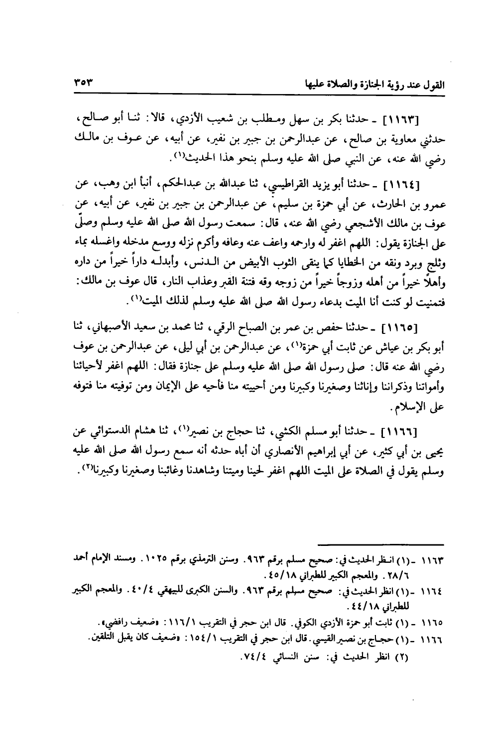 1164 - حَدَّثَنَا أَبُو يَزِيدَ الْقَرَاطِيسِيُّ، ثنا عَبْدُ اللَّهِ بْنُ عَبْدِ الْحَكَمِ، أَنْبَأَ ابْنُ وَهْبٍ، عَنْ عَمْرِو بْنِ الْحَارِثِ، عَنْ أَبِي حَمْزَةَ بْنِ سُلَيْمٍ، عَنْ عَبْدِ الرَّحْمَنِ بْنِ جُبَيْرِ بْنِ نُفَيْرٍ، عَنْ أَبِيهِ، عَنْ عَوْفِ بْنِ مَالِكٍ الْأَشْجَعِيِّ، رَضِيَ اللَّهُ عَنْهُ قَالَ: سَمِعْتُ رَسُولَ اللَّهِ صَلَّى اللهُ عَلَيْهِ وَسَلَّمَ وَصَلَّى عَلَى الْجَنَازَةِ يَقُولُ: «§اللَّهُمَّ اغْفِرْ لَهُ وَارْحَمْهُ، وَاعْفُ عَنْهُ وَعَافِهِ، وَأَكْرِمْ نُزُلَهُ، وَوَسِّعْ مُدْخَلَهُ، وَاغْسِلْهُ بِمَاءٍ وَثَلْجٍ وَبَرَدٍ، وَنَقِّهِ مِنَ الْخَطَايَا كَمَا يُنَقَّى الثَّوْبُ الْأَبْيَضُ مِنَ الدَّنَسِ، وَأَبْدِلْهُ دَارًا خَيْرًا مِنْ دَارِهِ، وَأَهْلًا خَيْرًا مِنْ أَهْلِهِ، وَزَوْجًا خَيْرًا مِنْ زَوْجِهِ، وَقِهِ فِتْنَةَ الْقَبْرِ وَعَذَابَ النَّارِ» ، قَالَ عَوْفُ بْنُ مَالِكٍ: فَتَمَنَّيْتُ لَوْ كُنْتُ أَنَا الْمَيِّتَ بِدُعَاءِ رَسُولِ اللَّهِ صَلَّى اللهُ عَلَيْهِ وَسَلَّمَ لِذَلِكَ الْمَيِّتِ