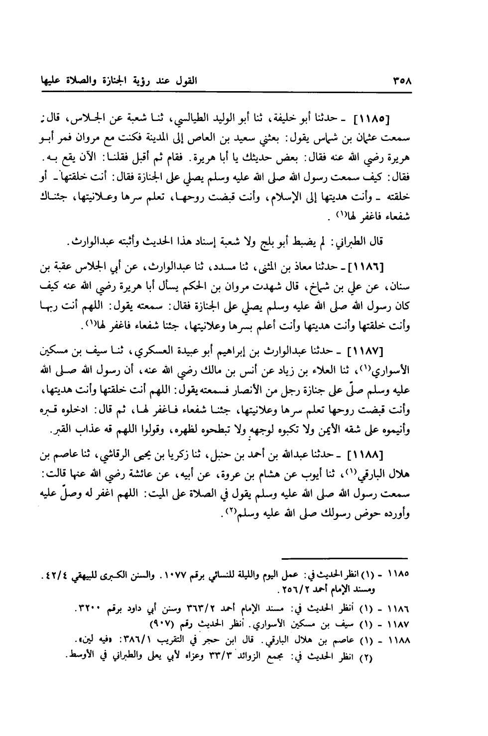 1185 - حَدَّثَنَا أَبُو خَلِيفَةَ، ثنا أَبُو الْوَلِيدِ الطَّيَالِسِيُّ، ثنا شُعْبَةُ، عَنِ الْجُلَاسِ، قَالَ: سَمِعْتُ عُثْمَانَ بْنَ شَمَّاسٍ، يَقُولُ: بَعَثَنِي سَعِيدُ بْنُ الْعَاصِ إِلَى الْمَدِينَةِ فَكُنْتُ مَعَ مَرْوَانَ، فَمَرَّ أَبُو هُرَيْرَةَ رَضِيَ اللَّهُ عَنْهُ فَقَالَ: بَعْضَ حَدِيثِكَ يَا أَبَا هُرَيْرَةَ، فَقَامَ ثُمَّ أَقْبَلَ فَقُلْنَا: الْآنَ يَقَعُ بِهِ، فَقَالَ: كَيْفَ سَمِعْتَ رَسُولَ اللَّهِ صَلَّى اللهُ عَلَيْهِ وَسَلَّمَ يُصَلِّي عَلَى الْجَنَازَةِ؟ فَقَالَ: «§أَنْتَ خَلَقْتَهَا أَوْ خَلَقْتَهُ، وَأَنْتَ هَدَيْتَهَا إِلَى الْإِسْلَامِ، وَأَنْتَ قَبَضْتَ رُوحَهَا، تَعْلَمُ سِرَّهَا وَعَلَانِيَتَهَا، جِئْنَاكَ شُفَعَاءَ فَاغْفِرْ لَهَا» قَالَ الطَّبَرَانِيُّ: لَمْ يَضْبِطْ أَبُو بَلْجٍ وَلَا شُعْبَةُ إِسْنَادَ هَذَا الْحَدِيثِ وَأَثْبَتَهُ عَبْدُ الْوَارِثِ