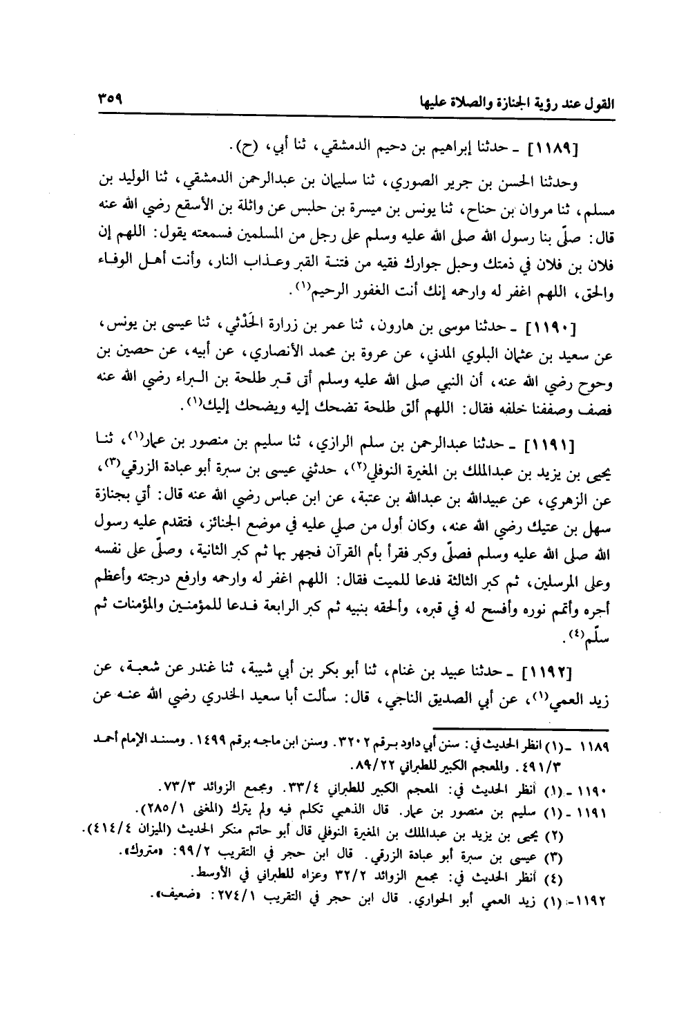 1190 - حَدَّثَنَا مُوسَى بْنُ هَارُونَ، ثنا عُمَرُ بْنُ زُرَارَةَ الْحَدَثِيُّ، ثنا عِيسَى بْنُ يُونُسَ، عَنْ سَعِيدِ بْنِ عُثْمَانَ الْبَلَوِيُّ الْمَدَنِيُّ، عَنْ عُرْوَةَ بْنِ مُحَمَّدٍ الْأَنْصَارِيِّ، عَنْ أَبِيهِ، عَنْ حُصَيْنِ بْنِ وَحْوَحٍ، رَضِيَ اللَّهُ عَنْهُ أَنَّ النَّبِيَّ صَلَّى اللهُ عَلَيْهِ وَسَلَّمَ أَتَى قَبْرَ طَلْحَةَ بْنِ الْبَرَاءِ رَضِيَ اللَّهُ عَنْهُ فَصَفَّ وَصَفَفْنَا خَلْفَهُ فَقَالَ: «§اللَّهُمَّ الْقَ طَلْحَةَ تَضْحَكُ إِلَيْهِ، وَيَضْحَكُ إِلَيْكَ»