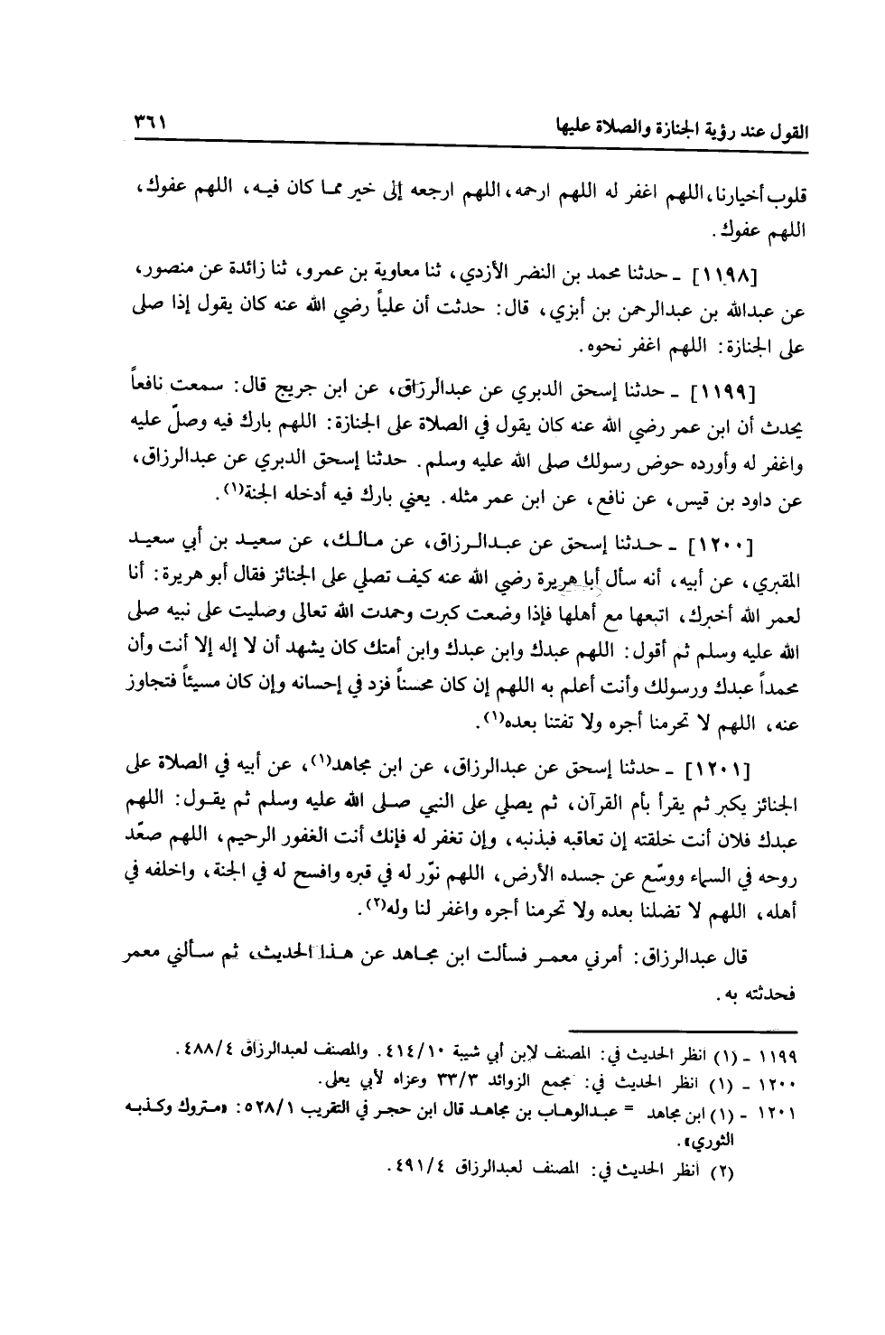 1199 - حَدَّثَنَا إِسْحَاقُ الدَّبَرِيُّ، عَنْ عَبْدِ الرَّزَّاقِ، عَنِ ابْنِ جُرَيْجٍ، قَالَ: سَمِعْتُ نَافِعًا، يُحَدِّثُ أَنَّ ابْنَ عُمَرَ، رَضِيَ اللَّهُ عَنْهُ كَانَ يَقُولُ فِي الصَّلَاةِ عَلَى الْجَنَازَةِ: «§اللَّهُمَّ بَارِكْ فِيهِ وَصَلِّ عَلَيْهِ، وَاغْفِرْ لَهُ، وَأَوْرِدْهُ حَوْضَ رَسُولِكَ صَلَّى اللهُ عَلَيْهِ وَسَلَّمَ» حَدَّثَنَا إِسْحَاقُ الدَّبَرِيُّ عَنْ عَبْدِ الرَّزَّاقِ عَنْ دَاوُدَ بْنِ قَيْسٍ، عَنْ نَافِعٍ عَنِ ابْنِ عُمَرَ مِثْلَهُ يَعْنِي بَارَكْ فِيهِ أَدْخَلَهُ الْجَنَّةَ