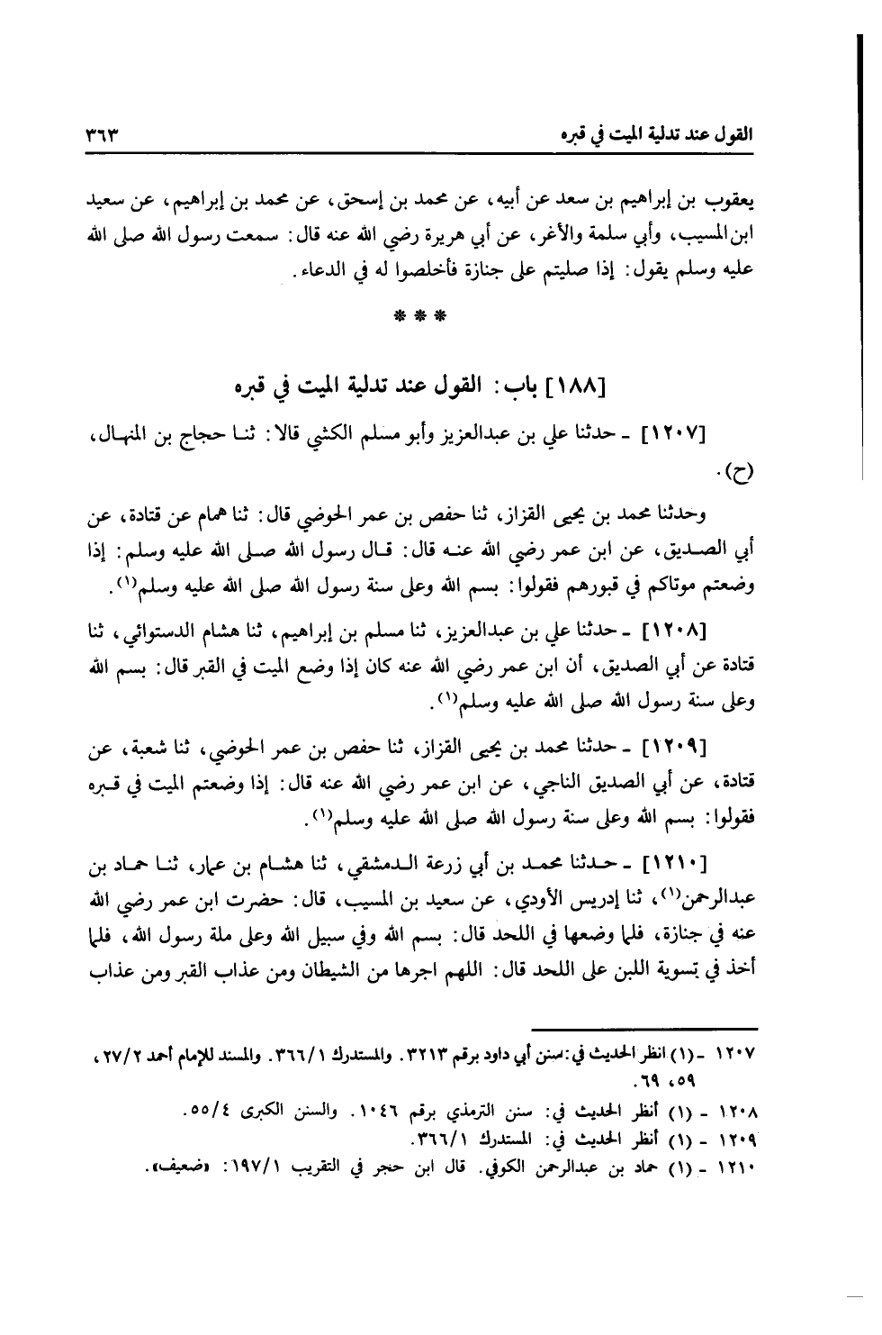 1210 - حَدَّثَنَا مُحَمَّدُ بْنُ أَبِي زُرْعَةَ الدِّمَشْقِيُّ، ثنا هِشَامُ بْنُ عَمَّارٍ، ثنا حَمَّادُ بْنُ عَبْدِ الرَّحْمَنِ، ثنا إِدْرِيسُ الْأَوْدِيُّ، عَنْ سَعِيدِ بْنِ الْمُسَيِّبِ، قَالَ: حَضَرْتُ ابْنَ عُمَرَ رَضِيَ اللَّهُ عَنْهُ فِي جَنَازَةٍ فَلَمَّا وَضَعَهَا فِي اللَّحْدِ قَالَ: " §بِسْمِ اللَّهِ وَفِي سَبِيلِ اللَّهِ وَعَلَى مِلَّةِ رَسُولِ اللَّهِ، فَلَمَّا أَخَذَ فِي تَسْوِيَةِ اللَّبَنِ عَلَى اللَّحْدِ قَالَ: «اللَّهُمَّ أَجِرْهَا مِنَ الشَّيْطَانِ وَمِنْ عَذَابِ الْقَبْرِ، وَمِنْ عَذَابِ -[364]- النَّارِ» ، فَلَمَّا سَوَّى الْكَثِيبَ عَلَيْهَا قَامَ جَانِبَ الْقَبْرِ ثُمَّ قَالَ: «اللَّهُمَّ جَافِ الْأَرْضَ عَنْ جَنْبِهَا، وَصَعِّدْ رُوحَهَا، وَلَقِّهَا مِنْكَ رِضْوَانًا» ، فَقُلْتُ: أَشَيْءٌ سَمِعْتَهُ مِنْ رَسُولِ اللَّهِ صَلَّى اللهُ عَلَيْهِ وَسَلَّمَ أَمْ شَيْءٌ قُلْتَ مِنْ رَأْيِكَ؟ قَالَ: إِنِّي إِذًا لَقَادِرٌ عَلَى الْقَوْلِ، بَلْ سَمِعْتُهُ مِنْ رَسُولِ اللَّهِ صَلَّى اللهُ عَلَيْهِ وَسَلَّمَ