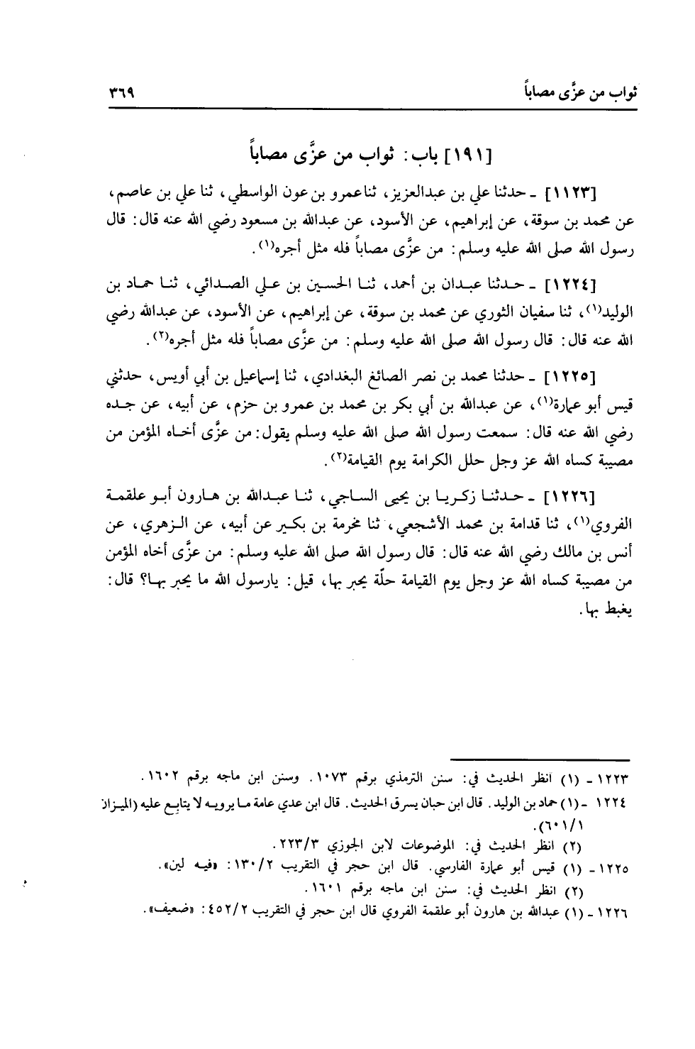 1226 - حَدَّثَنَا زَكَرِيَّا بْنُ يَحْيَى السَّاجِيُّ، ثنا عَبْدُ اللَّهِ بْنُ هَارُونَ أَبُو عَلْقَمَةَ الْفَرْوِيُّ، ثنا قُدَامَةُ بْنُ مُحَمَّدٍ الْأَشْجَعِيُّ، ثنا مَخْرَمَةُ بْنُ بُكَيْرٍ، عَنْ أَبِيهِ، عَنِ الزُّهْرِيِّ، عَنْ أَنَسِ بْنِ مَالِكٍ، رَضِيَ اللَّهُ عَنْهُ قَالَ: قَالَ رَسُولُ اللَّهِ صَلَّى اللهُ عَلَيْهِ وَسَلَّمَ: «§مَنْ عَزَّى أَخَاهُ الْمُؤْمِنَ مِنْ مُصِيبَةٍ كَسَاهُ اللَّهُ عَزَّ وَجَلَّ يَوْمَ الْقِيَامَةِ حُلَّةً يُحْبَرُ بِهَا» قِيلَ يَا رَسُولَ اللَّهِ: مَا يُحْبَرُ بِهَا؟ قَالَ: «يُغْبَطَ بِهَا»