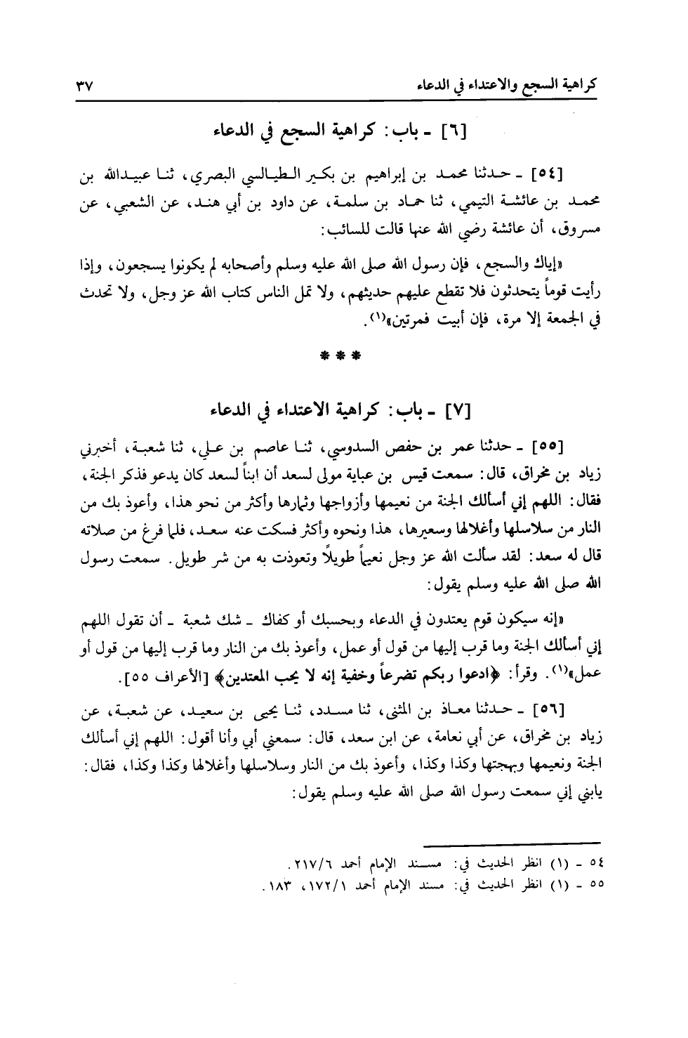 55 - حَدَّثَنَا عُمَرُ بْنُ حَفْصٍ السَّدُوسِيُّ، ثنا عَاصِمُ بْنُ عَلِيٍّ، ثنا شُعْبَةُ، أَخْبَرَنِي زِيَادُ بْنُ مِخْرَاقٍ، قَالَ: سَمِعْتُ قَيْسَ بْنَ عَبَايَةَ مَوْلًى لِسَعْدٍ أَنَّ ابْنًا لِسَعْدٍ كَانَ يَدْعُو فَذَكَرَ الْجَنَّةَ فَقَالَ: اللَّهُمَّ إِنِّي أَسْأَلُكَ الْجَنَّةَ مِنْ نَعِيمِهَا وَأَزْوَاجِهَا وَثِمَارِهَا - وَأَكْثَرَ مِنْ نَحْوِ هَذَا - وَأَعُوذُ بِكَ مِنَ النَّارِ مِنْ سَلَاسِلِهَا وَأَغْلَالِهَا وَسَعِيرِهَا - هَذَا وَنَحْوِهِ وَأَكْثَرَ - فَسَكَتَ عَنْهُ سَعْدٌ، فَلَمَّا فَرَغَ مِنْ صَلَاتِهِ قَالَ لَهُ سَعْدٌ: لَقَدْ سَأَلْتَ اللَّهَ عَزَّ وَجَلَّ نَعِيمًا طَوِيلًا وَتَعَوَّذْتَ بِهِ مِنْ شَرٍّ طَوِيلٍ، سَمِعْتُ رَسُولَ اللَّهِ صَلَّى اللهُ عَلَيْهِ وَسَلَّمَ يَقُولُ: «§إِنَّهُ سَيَكُونُ قَوْمٌ يَعْتَدُونَ فِي الدُّعَاءِ وَبِحَسْبِكَ أَوْ كَفَاكَ - شَكَّ شُعْبَةُ - أَنْ تَقُولَ اللَّهُمَّ إِنِّي أَسْأَلُكَ الْجَنَّةَ وَمَا قَرَّبَ إِلَيْهَا مِنْ قَوْلٍ أَوْ عَمَلٍ، وَأَعُوذُ بِكَ مِنَ النَّارِ وَمَا قَرَّبَ إِلَيْهَا مِنْ قَوْلٍ أَوْ عَمَلٍ» وَقَرَأَ {ادْعُوا رَبَّكُمْ تَضَرُّعًا وَخُفْيَةً إِنَّهُ لَا يُحِبُّ الْمُعْتَدِينَ} [الأعراف: 55]