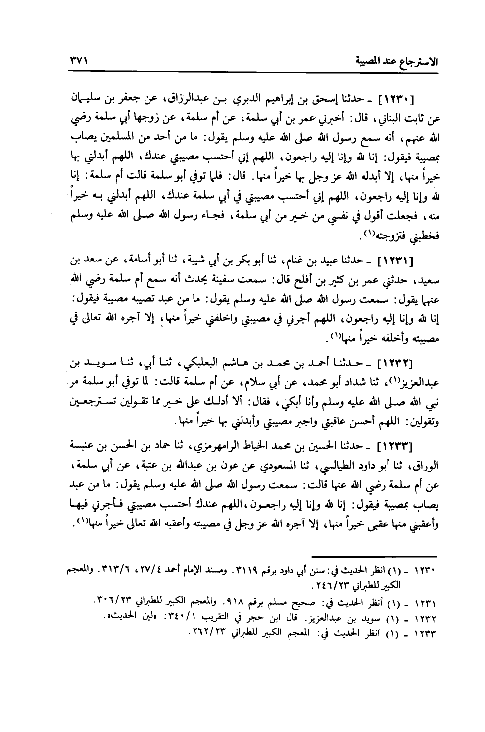 1230 - حَدَّثَنَا إِسْحَاقُ بْنُ إِبْرَاهِيمَ الدَّبَرِيُّ، عَنْ عَبْدِ الرَّزَّاقِ، عَنْ جَعْفَرِ بْنِ سُلَيْمَانَ، عَنْ ثَابِتٍ الْبُنَانِيِّ، قَالَ: أَخْبَرَنِي عُمَرُ بْنُ أَبِي سَلَمَةَ، عَنْ أُمِّ سَلَمَةَ، عَنْ زَوْجِهَا أَبِي سَلَمَةَ، رَضِيَ اللَّهُ عَنْهُمْ أَنَّهُ سَمِعَ رَسُولَ اللَّهِ صَلَّى اللهُ عَلَيْهِ وَسَلَّمَ يَقُولُ: " §مَا مِنْ أَحَدٍ مِنَ الْمُسْلِمِينَ يُصَابُ بِمُصِيبَةٍ فَيَقُولُ: {إِنَّا لِلَّهِ وَإِنَّا إِلَيْهِ رَاجِعُونَ} [البقرة: 156] ، اللَّهُمَّ إِنِّي أَحْتَسِبُ مُصِيبَتِي عِنْدَكَ، اللَّهُمَّ أَبْدِلْنِي بِهَا خَيْرًا مِنْهَا إِلَّا أَبْدَلَهُ اللَّهُ عَزَّ وَجَلَّ بِهَا خَيْرًا مِنْهَا " قَالَ: فَلَمَّا تُوُفِّيَ أَبُو سَلَمَةَ قَالَتْ أُمُّ سَلَمَةَ: {إِنَّا لِلَّهِ وَإِنَّا إِلَيْهِ رَاجِعُونَ} [البقرة: 156] ، اللَّهُمَّ إِنِّي أَحْتَسِبُ مُصِيبَتِي فِي أَبِي سَلَمَةَ عِنْدَكَ، اللَّهُمَّ أَبْدِلْنِي بِهِ خَيْرًا مِنْهُ، فَجَعَلْتُ أَقُولُ فِي نَفْسِي مَنْ خَيْرٌ مِنْ أَبِي سَلَمَةَ فَجَاءَ رَسُولُ اللَّهِ صَلَّى اللهُ عَلَيْهِ وَسَلَّمَ فَخَطَبَنِي فَتَزَوَّجْتُهُ