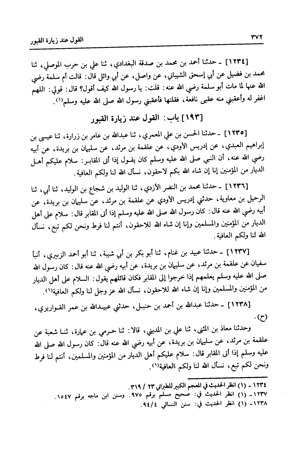 1237 - حَدَّثَنَا عُبَيْدُ بْنُ غَنَّامٍ، ثنا أَبُو بَكْرِ بْنُ أَبِي شَيْبَةَ، ثنا أَبُو أَحْمَدَ الزُّبَيْرِيُّ، أَنْبَأَ سُفْيَانُ، عَنْ عَلْقَمَةَ بْنِ مَرْثَدٍ، عَنْ سُلَيْمَانَ بْنِ بُرَيْدَةَ، عَنْ أَبِيهِ، رَضِيَ اللَّهُ عَنْهُ قَالَ: كَانَ رَسُولُ اللَّهِ صَلَّى اللهُ عَلَيْهِ وَسَلَّمَ يُعَلِّمُهُمْ إِذَا خَرَجُوا إِلَى الْمَقَابِرِ فَكَانَ قَائِلُهُمْ يَقُولُ: «§السَّلَامُ عَلَى أَهْلِ الدِّيَارِ مِنَ الْمُؤْمِنِينَ وَالْمُسْلِمِينَ، وَإِنَّا إِنْ شَاءَ اللَّهُ لَلَاحِقُونَ، نَسْأَلُ اللَّهَ عَزَّ وَجَلَّ لَنَا وَلَكُمُ الْعَافِيَةَ»