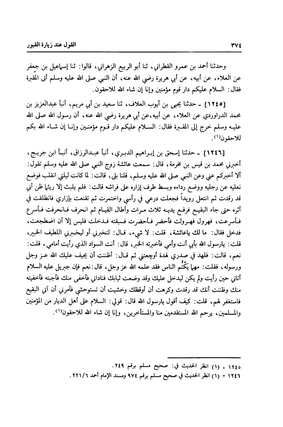 1246 - حَدَّثَنَا إِسْحَاقُ بْنُ إِبْرَاهِيمَ الدَّبَرِيُّ، أَنْبَأَ عَبْدُ الرَّزَّاقِ، أَنْبَأَ ابْنُ جُرَيْجٍ، أَخْبَرَنِي مُحَمَّدُ بْنُ قَيْسِ بْنِ مَخْرَمَةَ، قَالَ: سَمِعْتُ عَائِشَةَ، زَوْجَ النَّبِيِّ صَلَّى اللهُ عَلَيْهِ وَسَلَّمَ تَقُولُ: أَلَا أُخْبِرُكُمْ عَنِّي وَعَنِ النَّبِيِّ صَلَّى اللهُ عَلَيْهِ وَسَلَّمَ؟ قُلْنَا: بَلَى، قَالَتْ: لَمَّا كَانَتْ لَيْلَتِي انْقَلَبَ فَوَضَعَ نَعْلَيْهِ عَنْ رِجْلَيْهِ، وَوَضَعَ رِدَاءَهُ، وَبَسَطَ طَرْفَ إِزَارِهِ عَلَى فِرَاشِهِ، قَالَتْ: فَلَمْ يَلْبَثْ إِلَّا رَيْثَمَا ظَنَّ أَنِّي قَدْ رَقَدْتُ، ثُمَّ انْتَعَلَ رُوَيْدًا، فَجَعَلْتُ دِرْعِي فِي رَأْسِي وَاخْتَمَرْتُ، ثُمَّ تَقَنَّعْتُ بِإِزَارِي، فَانْطَلَقْتُ فِي أَثَرِهِ حَتَّى جَاءَ الْبَقِيعَ فَرَفَعَ يَدَيْهِ ثَلَاثَ مَرَّاتٍ وَأَطَالَ الْقِيَامَ، ثُمَّ انْحَرَفَ فَانْحَرَفْتُ، فَأَسْرَعَ فَأَسْرَعْتُ، فَهَرْوَلَ فَهَرْوَلْتُ، فَأَحْضَرَ فَأَحْضَرْتُ، فَسَبَقْتُهُ فَدَخَلْتُ فَلَيْسَ إِلَّا أَنِ اضْطَجَعْتُ فَدَخَلَ فَقَالَ: «مَا لَكِ يَا عَائِشَةُ؟» قُلْتُ: لَا شَيْءَ، قَالَ: «لَتُخْبِرِنِّي أَوْ لَيُخْبِرَنِّي اللَّطِيفُ الْخَبِيرُ» قُلْتُ: يَا رَسُولَ اللَّهِ بِأَبِي أَنْتَ وَأُمِّي فَأَخْبَرْتُهُ الْخَبَرَ قَالَ: «أَنْتِ السَّوَادُ الَّذِي رَأَيْتُ أَمَامِي؟» قُلْتُ: نَعَمْ، قَالَتْ: فَلَهَدَ فِي صَدْرِي لَهْدَةً أَوْجَعَتْنِي ثُمَّ قَالَ: «أَظَنَنْتِ أَنْ يَحِيفَ عَلَيْكِ اللَّهُ عَزَّ وَجَلَّ وَرَسُولُهُ؟» فَقُلْتُ: مَهْمَا يَكْتُمُ النَّاسُ فَقَدْ عَلِمَهُ اللَّهُ عَزَّ وَجَلَّ، قَالَ: «نَعَمْ فَإِنَّ جِبْرِيلَ عَلَيْهِ السَّلَامُ أَتَانِي حِينَ رَأَيْتِ، وَلَمْ يَكُنْ لِيَدْخُلَ عَلَيْكِ وَقَدْ وَضَعْتِ ثِيَابَكِ، فَنَادَانِي فَأَخْفَى مِنْكِ، فَأَجَبْتُهُ فَأَخْفَيْتُهُ مِنْكِ، وَظَنَنْتُ أَنَّكِ قَدْ رَقَدْتِ، وَكَرِهْتُ أَنْ أُوقِظَكِ وَخَشِيتُ أَنْ تَسْتَوْحِشِيَ، فَأَمَرَنِي أَنْ آتِيَ الْبَقِيعَ فَأَسْتَغْفِرَ لَهُمْ» قُلْتُ: كَيْفَ أَقُولُ يَا رَسُولَ اللَّهِ؟ قَالَ: «§قُولِي السَّلَامُ عَلَى أَهْلِ الدِّيَارِ مِنَ الْمُؤْمِنِينَ وَالْمُسْلِمِينَ، يَرْحَمُ اللَّهُ الْمُسْتَقْدِمِينَ مِنَّا وَالْمُسْتَأْخِرِينَ، وَإِنَّا إِنْ شَاءَ اللَّهُ لَلَاحِقُونَ»