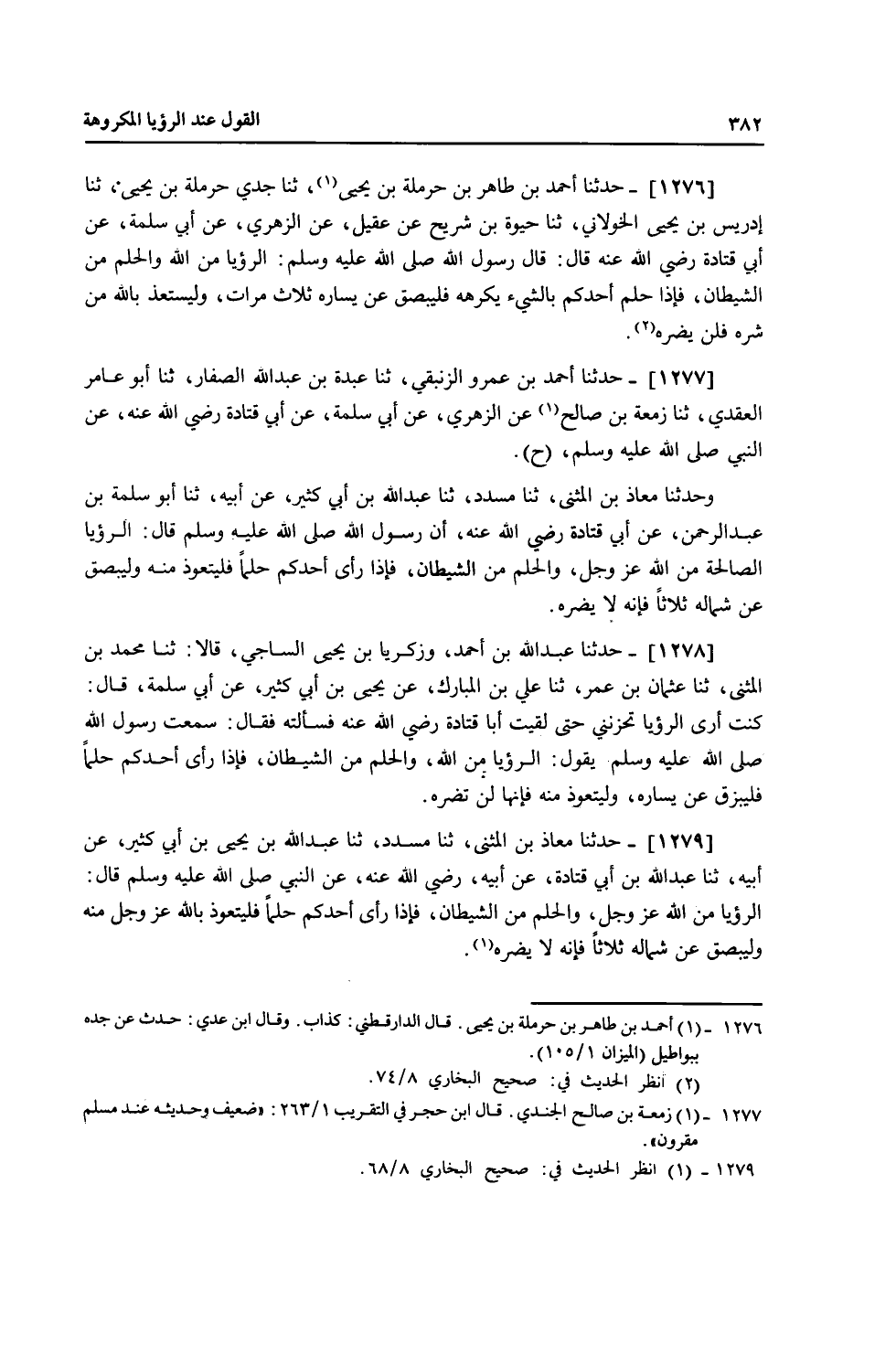 1277 - حَدَّثَنَا أَحْمَدُ بْنُ عَمْرٍو الزِّنْبَقِيُّ، ثنا عَبْدَةُ بْنُ عَبْدِ اللَّهِ الصَّفَّارُ، ثنا أَبُو عَامِرٍ الْعَقَدِيُّ، ثنا زَمْعَةُ بْنُ صَالِحٍ، عَنِ الزُّهْرِيِّ، عَنْ أَبِي سَلَمَةَ، عَنْ أَبِي قَتَادَةَ، رَضِيَ اللَّهُ عَنْهُ عَنِ النَّبِيِّ صَلَّى اللهُ عَلَيْهِ وَسَلَّمَ، ح وَحَدَّثَنَا مُعَاذُ بْنُ الْمُثَنَّى، ثنا مُسَدَّدٌ، ثنا عَبْدُ اللَّهِ بْنُ أَبِي كَثِيرٍ، عَنْ أَبِيهِ، ثنا أَبُو سَلَمَةَ بْنُ عَبْدِ الرَّحْمَنِ، عَنْ أَبِي قَتَادَةَ، رَضِيَ اللَّهُ عَنْهُ أَنَّ رَسُولَ اللَّهِ صَلَّى اللهُ عَلَيْهِ وَسَلَّمَ قَالَ: «§الرُّؤْيَا الصَّالِحَةُ مِنَ اللَّهِ عَزَّ وَجَلَّ، وَالْحُلْمُ مِنَ الشَّيْطَانِ، فَإِذَا رَأَى أَحَدُكُمْ حُلْمًا فَلْيَتَعَوَّذْ مِنْهُ وَلْيَبْصُقْ عَنْ شِمَالِهِ ثَلَاثًا فَإِنَّهُ لَا يَضُرُّهُ»