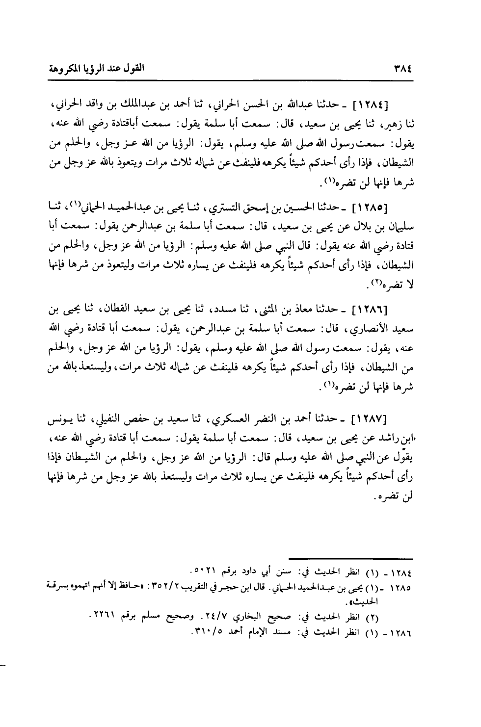 1284 - حَدَّثَنَا عَبْدُ اللَّهِ بْنُ الْحَسَنِ الْحَرَّانِيُّ، ثنا أَحْمَدُ بْنُ عَبْدِ الْمَلِكِ بْنِ وَاقِدٍ الْحَرَّانِيُّ، ثنا زُهَيْرٌ، ثنا يَحْيَى بْنُ سَعِيدٍ، قَالَ: سَمِعْتُ أَبَا سَلَمَةَ، يَقُولُ: سَمِعْتُ أَبَا قَتَادَةَ، رَضِيَ اللَّهُ عَنْهُ يَقُولُ: سَمِعْتُ رَسُولَ اللَّهِ صَلَّى اللهُ عَلَيْهِ وَسَلَّمَ يَقُولُ: «§الرُّؤْيَا مِنَ اللَّهِ عَزَّ وَجَلَّ، وَالْحُلْمُ مِنَ الشَّيْطَانِ، فَإِذَا رَأَى أَحَدُكُمْ شَيْئًا يَكْرَهُهُ فَلْيَتْفُلْ عَنْ شِمَالِهِ ثَلَاثَ مَرَّاتٍ وَيَتَعَوَّذْ بِاللَّهِ عَزَّ وَجَلَّ مِنْ شَرِّهَا فَإِنَّهَا لَنْ تَضُرَّهُ»