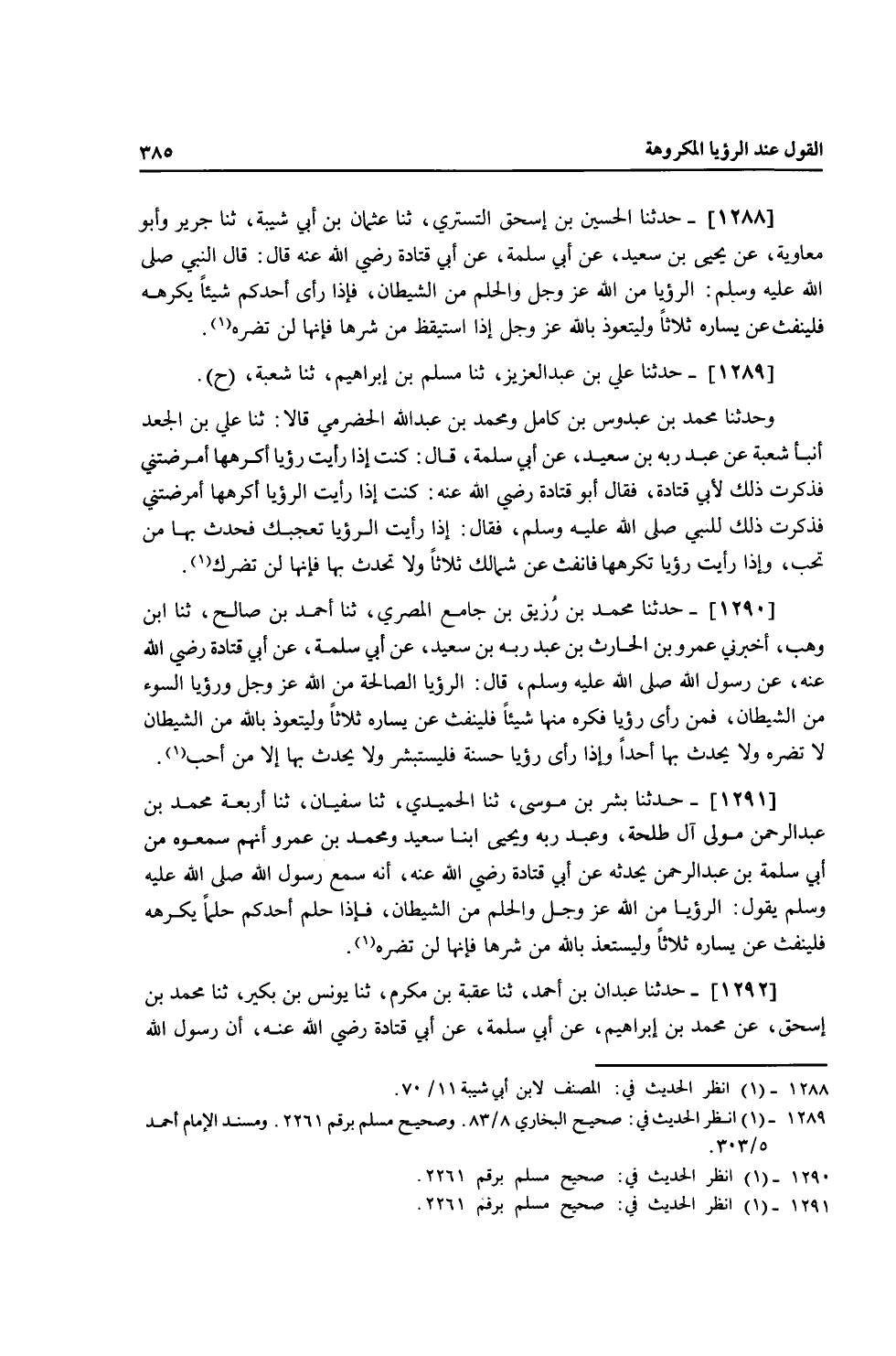 1288 - حَدَّثَنَا الْحُسَيْنُ بْنُ إِسْحَاقَ التُّسْتَرِيُّ، ثنا عُثْمَانُ بْنُ أَبِي شَيْبَةَ، ثنا جَرِيرٌ، وَأَبُو مُعَاوِيَةَ، عَنْ يَحْيَى بْنِ سَعِيدٍ، عَنْ أَبِي سَلَمَةَ، عَنْ أَبِي قَتَادَةَ، رَضِيَ اللَّهُ عَنْهُ قَالَ: قَالَ النَّبِيُّ صَلَّى اللهُ عَلَيْهِ وَسَلَّمَ: «§الرُّؤْيَا مِنَ اللَّهِ عَزَّ وَجَلَّ، وَالْحُلْمُ مِنَ الشَّيْطَانِ، فَإِذَا رَأَى أَحَدُكُمْ شَيْئًا يَكْرَهُهُ فَلْيَتْفُلْ عَنْ يَسَارِهِ ثَلَاثًا وَلْيَتَعَوَّذْ بِاللَّهِ عَزَّ وَجَلَّ إِذَا اسْتَيْقَظَ مِنْ شَرِّهَا فَإِنَّهَا لَنْ تَضُرَّهُ»