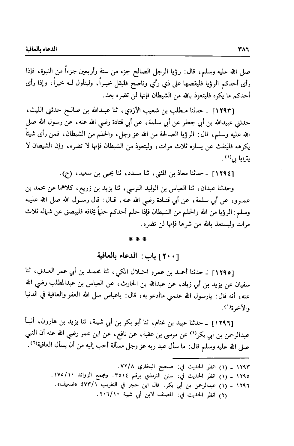 1296 - حَدَّثَنَا عُبَيْدُ بْنُ غَنَّامٍ، ثنا أَبُو بَكْرِ بْنُ أَبِي شَيْبَةَ، ثنا يَزِيدُ بْنُ هَارُونَ، أَنْبَأَ عَبْدُ الرَّحْمَنِ بْنُ أَبِي بَكْرٍ، عَنْ مُوسَى بْنِ عُقْبَةَ، عَنْ نَافِعٍ، عَنِ ابْنِ عُمَرَ، رَضِيَ اللَّهُ عَنْهُ أَنَّ النَّبِيَّ صَلَّى اللهُ عَلَيْهِ وَسَلَّمَ قَالَ: «§مَا سَأَلَ عَبْدٌ رَبَّهُ عَزَّ وَجَلَّ مَسْأَلَةً أَحَبَّ إِلَيْهِ مِنْ أَنْ يَسْأَلَ الْعَافِيَةَ»