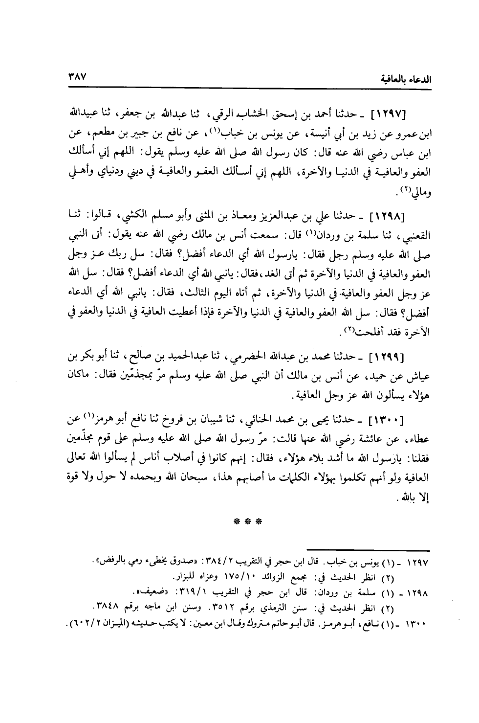 1299 - حَدَّثَنَا مُحَمَّدُ بْنُ عَبْدِ اللَّهِ الْحَضْرَمِيُّ، ثنا عَبْدُ الْحَمِيدِ بْنُ صَالِحٍ، ثنا أَبُو بَكْرِ بْنُ عَيَّاشٍ، عَنْ حُمَيْدٍ، عَنْ أَنَسِ بْنِ مَالِكٍ، أَنَّ النَّبِيَّ صَلَّى اللهُ عَلَيْهِ وَسَلَّمَ مَرَّ بِمُجَذَّمِينَ فَقَالَ: «§مَا كَانَ هَؤُلَاءِ يَسْأَلُونَ اللَّهَ عَزَّ وَجَلَّ الْعَافِيَةَ»