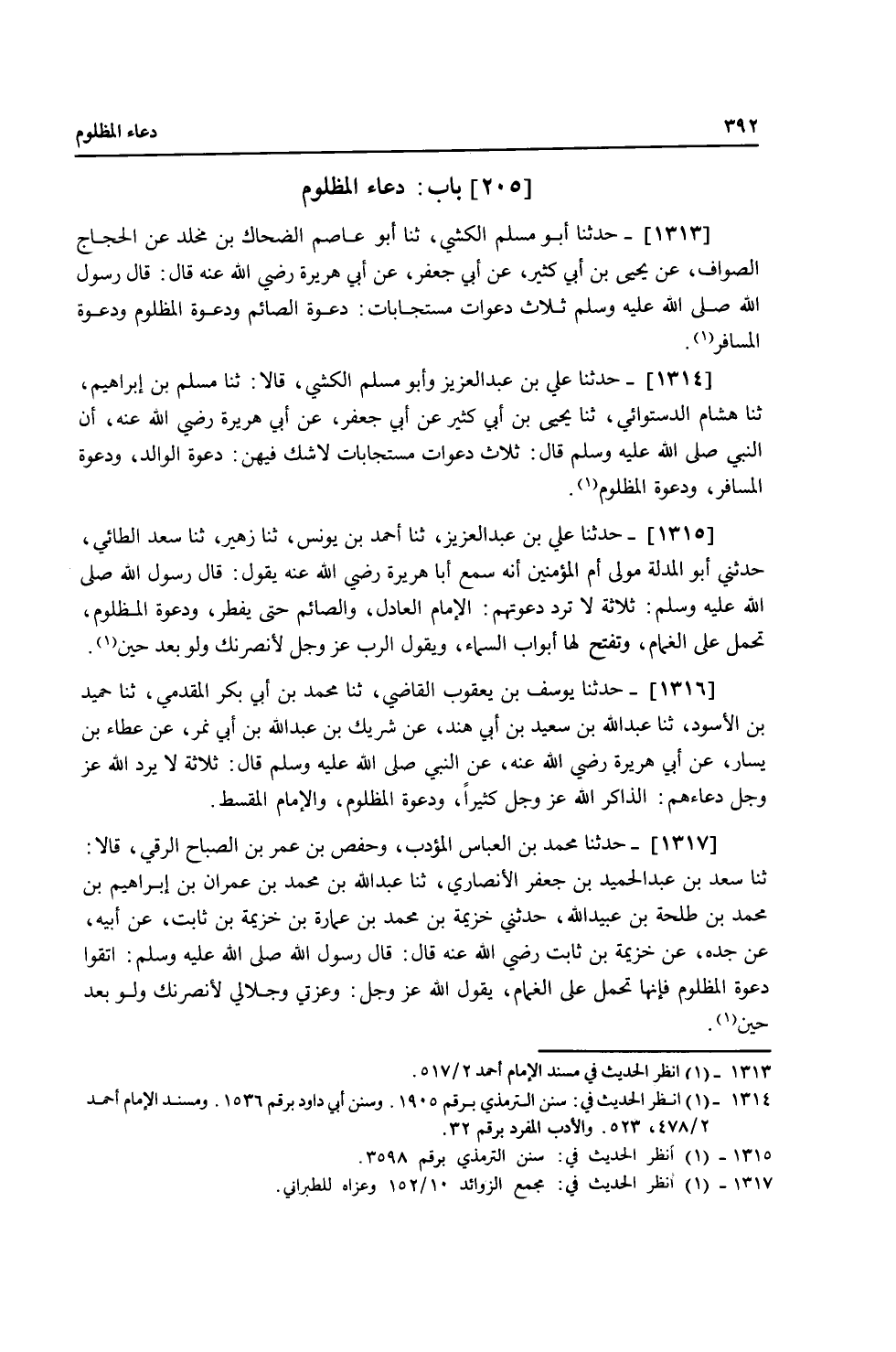 1314 - حَدَّثَنَا عَلِيُّ بْنُ عَبْدِ الْعَزِيزِ، وَأَبُو مُسْلِمٍ الْكَشِّيُّ قَالَا: ثنا مُسْلِمُ بْنُ إِبْرَاهِيمَ، ثنا هِشَامٌ الدَّسْتُوَائِيُّ، ثنا يَحْيَى بْنُ أَبِي كَثِيرٍ، عَنْ أَبِي جَعْفَرٍ، عَنْ أَبِي هُرَيْرَةَ، رَضِيَ اللَّهُ عَنْهُ أَنَّ النَّبِيَّ صَلَّى اللهُ عَلَيْهِ وَسَلَّمَ قَالَ: " §ثَلَاثُ دَعَوَاتٍ مُسْتَجَابَاتٌ لَا شَكَّ فِيهِنَّ: دَعْوَةُ الْوَالِدِ، وَدَعْوَةُ الْمُسَافِرِ، وَدَعْوَةُ الْمَظْلُومِ "