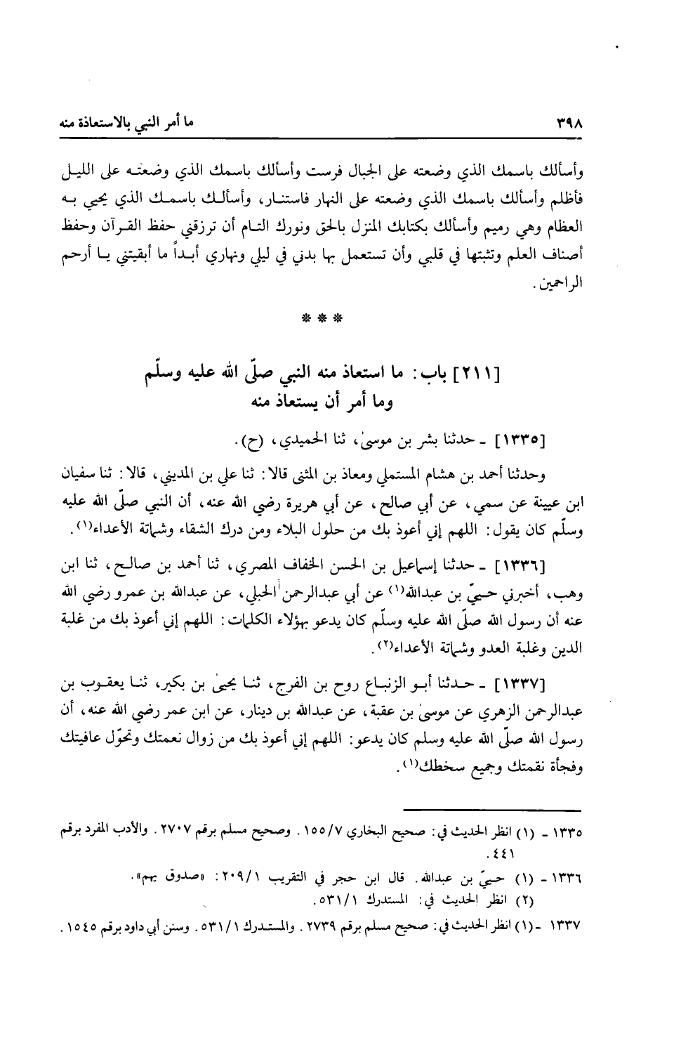 1335 - حَدَّثَنَا بِشْرُ بْنُ مُوسَى، ثنا الْحُمَيْدِيُّ، ح وَحَدَّثَنَا أَحْمَدُ بْنُ هِشَامٍ الْمُسْتَمْلِي، وَمُعَاذُ بْنُ الْمُثَنَّى، قَالَا: ثنا عَلِيُّ بْنُ الْمَدِينِيِّ، قَالَا: ثنا سُفْيَانُ بْنُ عُيَيْنَةَ، عَنْ سُمَيٍّ، عَنْ أَبِي صَالِحٍ، عَنْ أَبِي هُرَيْرَةَ، رَضِيَ اللَّهُ عَنْهُ أَنَّ النَّبِيَّ صَلَّى اللهُ عَلَيْهِ وَسَلَّمَ كَانَ يَقُولُ: «§اللَّهُمَّ إِنِّي أَعُوذُ بِكَ مِنْ حُلُولِ الْبَلَاءِ، وَمِنْ دَرْكِ الشَّقَاءِ وَشَمَاتَةِ الْأَعْدَاءِ»