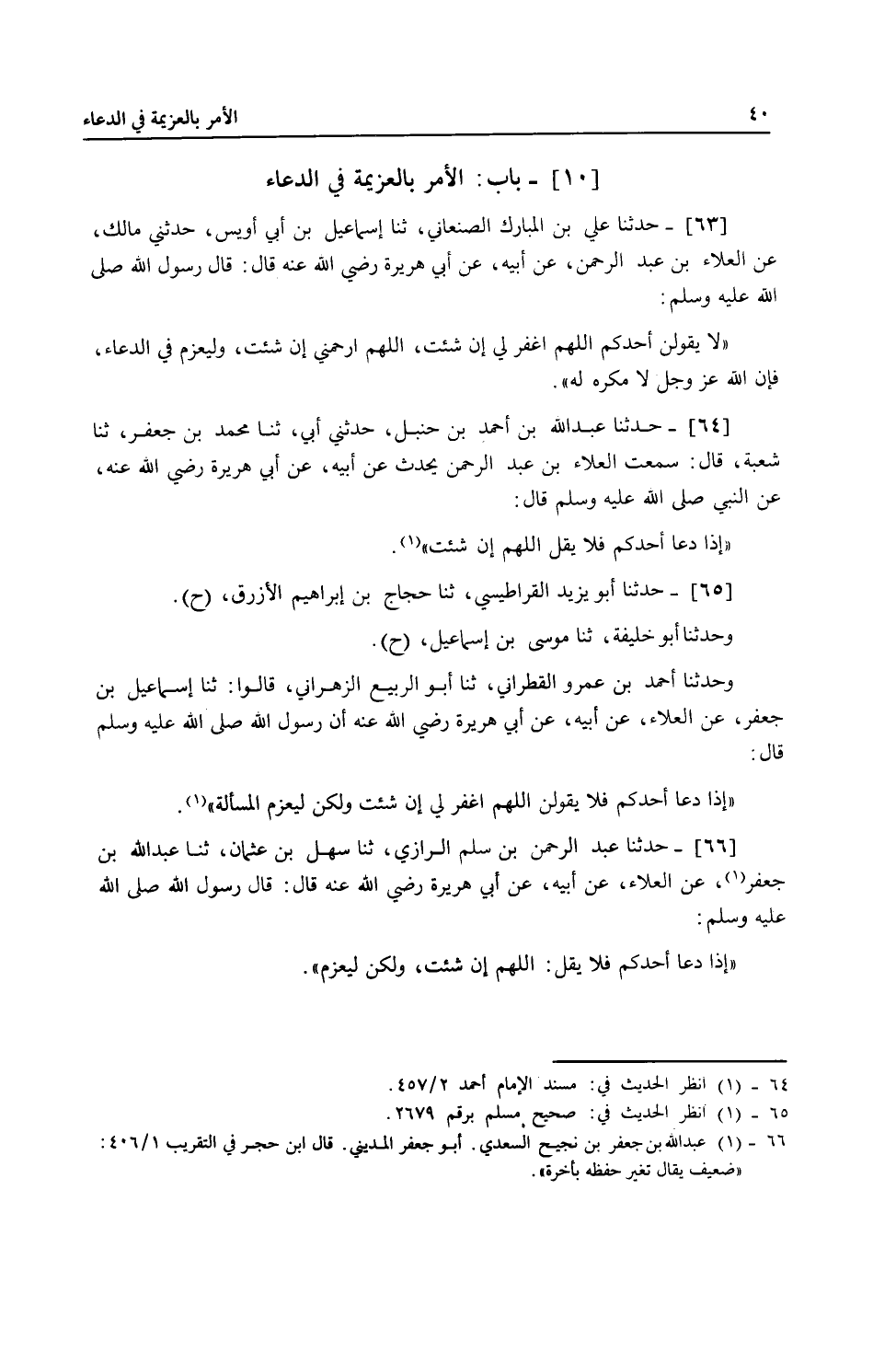66 - حَدَّثَنَا عَبْدُ الرَّحْمَنِ بْنُ سَلْمٍ الرَّازِيُّ، ثنا سَهْلُ بْنُ عُثْمَانَ، ثنا عَبْدُ اللَّهِ بْنُ جَعْفَرٍ، عَنِ الْعَلَاءِ، عَنْ أَبِيهِ، عَنْ أَبِي هُرَيْرَةَ، رَضِيَ اللَّهُ عَنْهُ قَالَ: قَالَ رَسُولُ اللَّهِ صَلَّى اللهُ عَلَيْهِ وَسَلَّمَ: «§إِذَا دَعَا أَحَدُكُمْ فَلَا يَقُلِ اللَّهُمَّ إِنْ شِئْتَ وَلَكِنْ لِيَعْزِمْ»
