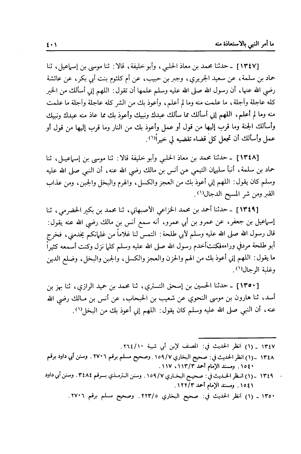 1348 - حَدَّثَنَا مُحَمَّدُ بْنُ مُعَاذٍ الْحَلَبِيُّ، وَأَبُو خَلِيفَةَ قَالَا: ثنا مُوسَى بْنُ إِسْمَاعِيلَ، ثنا حَمَّادُ بْنُ سَلَمَةَ، أَنْبَأَ سُلَيْمَانُ التَّيْمِيُّ، عَنْ أَنَسِ بْنِ مَالِكٍ، رَضِيَ اللَّهُ عَنْهُ أَنَّ النَّبِيَّ صَلَّى اللهُ عَلَيْهِ وَسَلَّمَ كَانَ يَقُولُ: «§اللَّهُمَّ إِنِّي أَعُوذُ بِكَ مِنَ الْعَجْزِ، وَالْكَسَلِ، وَالْهَرَمِ، وَالْبُخْلِ، وَالْجُبْنِ، وَمِنْ عَذَابِ الْقَبْرِ، وَمِنْ شَرِّ الْمَسِيحِ الدَّجَّالِ»