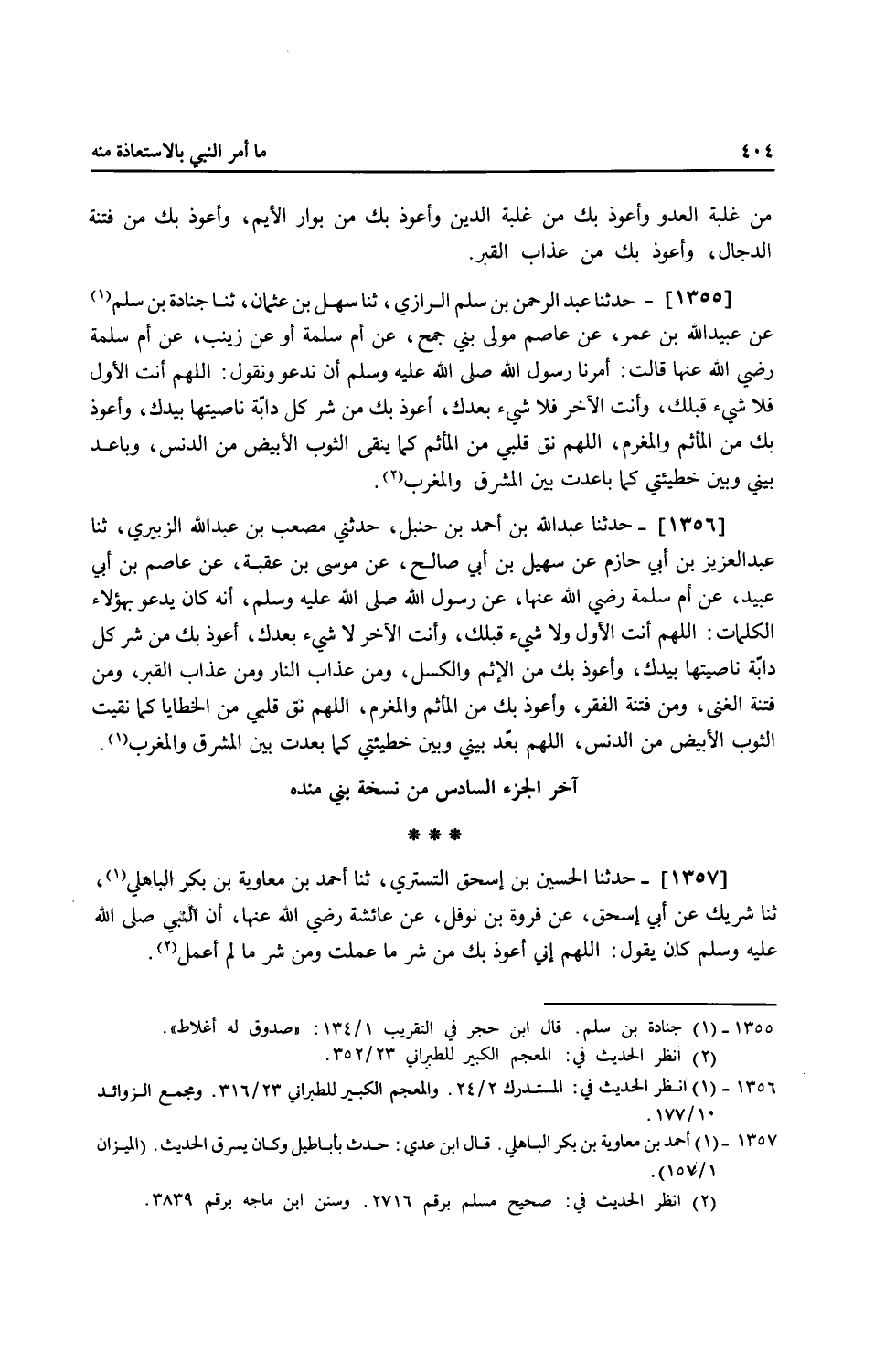 1355 - حَدَّثَنَا عَبْدُ الرَّحْمِنْ بْنُ سَلْمٍ الرَّازِيُّ، ثنا سَهْلُ بْنُ عُثْمَانَ، ثنا جُنَادَةُ بْنُ سَلْمٍ، عَنْ عُبَيْدِ اللَّهِ بْنِ عُمَرَ، عَنْ عَاصِمٍ، مَوْلَى بَنِي جُمَحَ عَنْ أُمِّ سَلَمَةَ، أَوْ عَنْ زَيْنَبَ، عَنْ أُمِّ سَلَمَةَ، رَضِيَ اللَّهُ عَنْهَا قَالَتْ: أَمَرَنَا رَسُولُ اللَّهِ صَلَّى اللهُ عَلَيْهِ وَسَلَّمَ أَنْ نَدْعُوَ وَنَقُولَ: «§اللَّهُمَّ أَنْتَ الْأَوَّلُ فَلَا شَيْءَ قَبْلَكَ، وَأَنْتَ الْآخِرُ فَلَا شَيْءَ بَعْدَكَ، أَعُوذُ بِكَ مِنْ شَرِّ كُلِّ دَابَّةٍ نَاصِيَتُهَا بِيَدِكَ، وَأَعُوذُ بِكَ مِنَ الْمَأْثَمِ وَالْمَغْرَمِ، اللَّهُمَّ نَقِّ قَلْبِي مِنَ الْمَأْثَمِ كَمَا يُنَقَّى الثَّوْبُ الْأَبْيَضُ مِنَ الدَّنَسِ، وَبَاعِدْ بَيْنِي وَبَيْنَ خَطِيئَتِي كَمَا بَاعَدْتَ بَيْنَ الْمَشْرِقِ وَالْمَغْرِبِ»