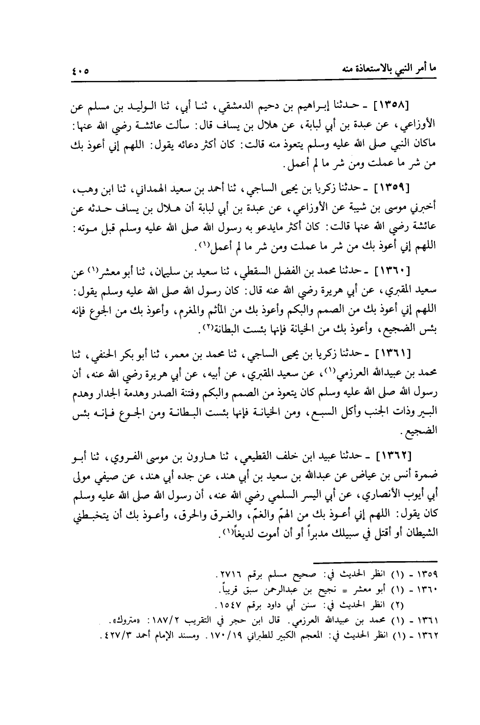1358 - حَدَّثَنَا إِبْرَاهِيمُ بْنُ دُحَيْمٍ الدِّمَشْقِيُّ، ثنا أَبِي، ثنا الْوَلِيدُ بْنُ مُسْلِمٍ، عَنِ الْأَوْزَاعِيِّ، عَنْ عَبْدَةَ بْنِ أَبِي لُبَابَةَ، عَنْ هِلَالِ بْنِ يِسَافٍ، قَالَ: سَأَلْتُ عَائِشَةَ رَضِيَ اللَّهُ عَنْهَا مَا كَانَ النَّبِيُّ صَلَّى اللهُ عَلَيْهِ وَسَلَّمَ يَتَعَوَّذُ مِنْهُ؟ قَالَتَ: كَانَ أَكْثَرُ دُعَائِهِ يَقُولُ: «§اللَّهُمَّ إِنِّي أَعُوذُ بِكَ مِنْ شَرِّ مَا عَمِلْتُ، وَمِنْ شَرِّ مَا لَمْ أَعْمَلْ»