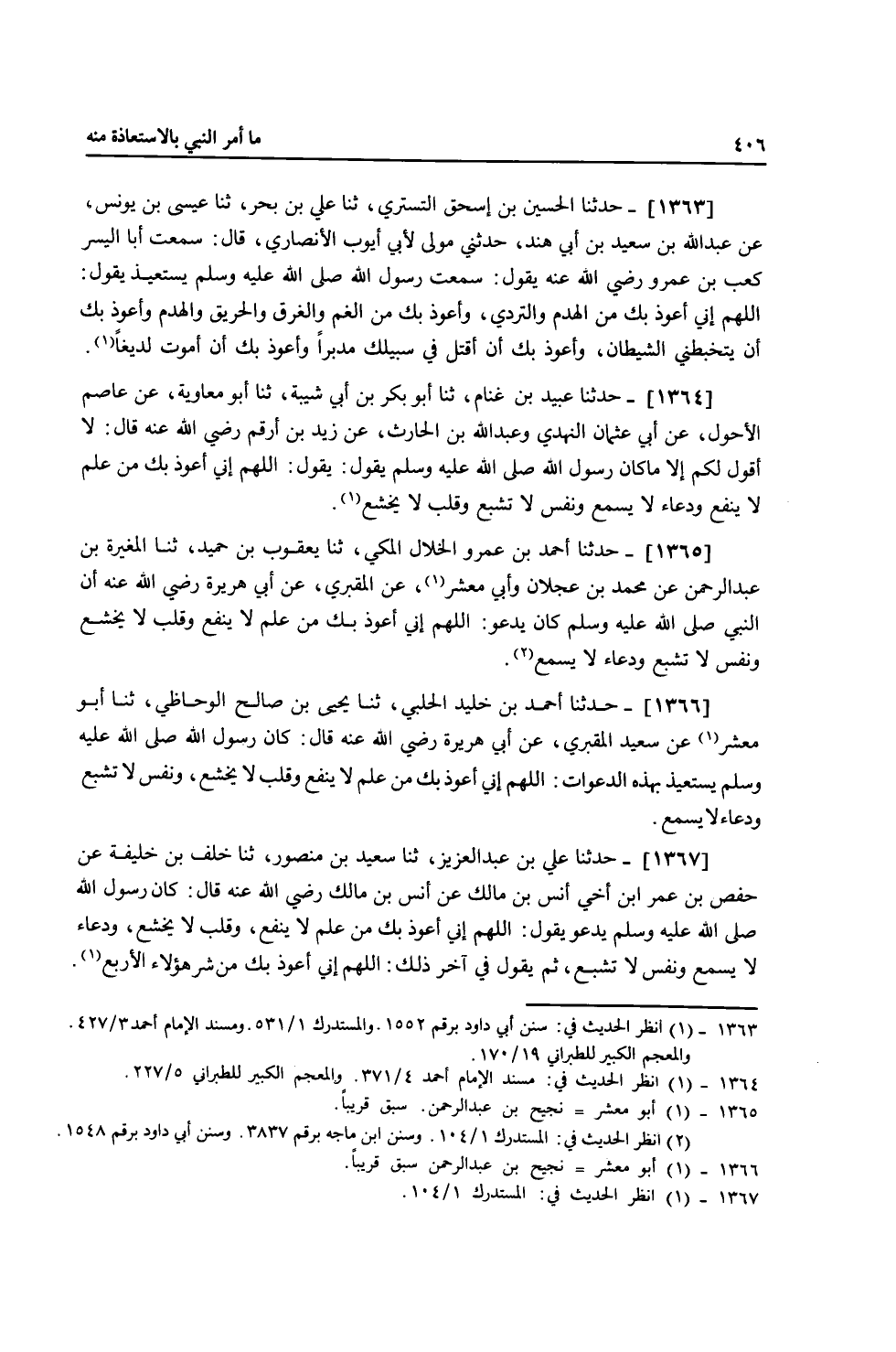 1367 - حَدَّثَنَا عَلِيُّ بْنُ عَبْدِ الْعَزِيزِ، ثنا سَعِيدُ بْنُ مَنْصُورٍ، ثنا خَلَفُ بْنُ خَلِيفَةَ، عَنْ حَفْصِ بْنِ عُمَرَ ابْنِ أَخِي أَنَسِ بْنِ مَالِكٍ، عَنْ أَنَسِ بْنِ مَالِكٍ، رَضِيَ اللَّهُ عَنْهُ قَالَ: كَانَ رَسُولُ اللَّهِ صَلَّى اللهُ عَلَيْهِ وَسَلَّمَ يَدْعُو يَقُولُ: «اللَّهُمَّ إِنِّي §أَعُوذُ بِكَ مِنْ عِلْمٍ لَا يَنْفَعُ، وَقَلْبٍ لَا يَخْشَعُ، وَدُعَاءٍ لَا يُسْمَعُ، وَنَفْسٍ لَا تَشْبَعُ» ثُمَّ يَقُولُ فِي آخِرِ ذَلِكَ: «اللَّهُمَّ إِنِّي أَعُوذُ بِكَ مِنْ شَرِّ هَؤُلَاءِ الْأَرْبَعِ»