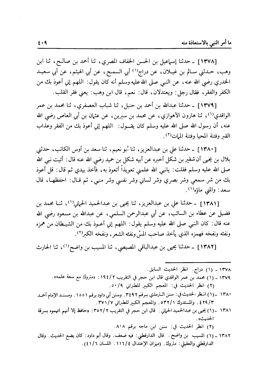 1379 - حَدَّثَنَا عَبْدُ اللَّهِ بْنُ أَحْمَدَ بْنِ حَنْبَلٍ، ثنا شَبَابٌ الْعُصْفُرِيُّ، ثنا مُحَمَّدُ بْنُ عُمَرَ الْوَاقِدِيُّ، ثنا هَارُونُ الْأَهْوَازِيُّ، عَنْ مُحَمَّدِ بْنِ سِيرِينَ، عَنْ عُثْمَانَ بْنِ أَبِي الْعَاصِ، رَضِيَ اللَّهُ عَنْهُ أَنَّ رَسُولَ اللَّهِ صَلَّى اللهُ عَلَيْهِ وَسَلَّمَ كَانَ يَقُولُ: «§اللَّهُمَّ إِنِّي أَعُوذُ بِكَ مِنَ الْفَقْرِ وَعَذَابِ الْقَبْرِ، وَفِتْنَةِ الْمَحْيَا وَفِتْنَةِ الْمَمَاتِ»
