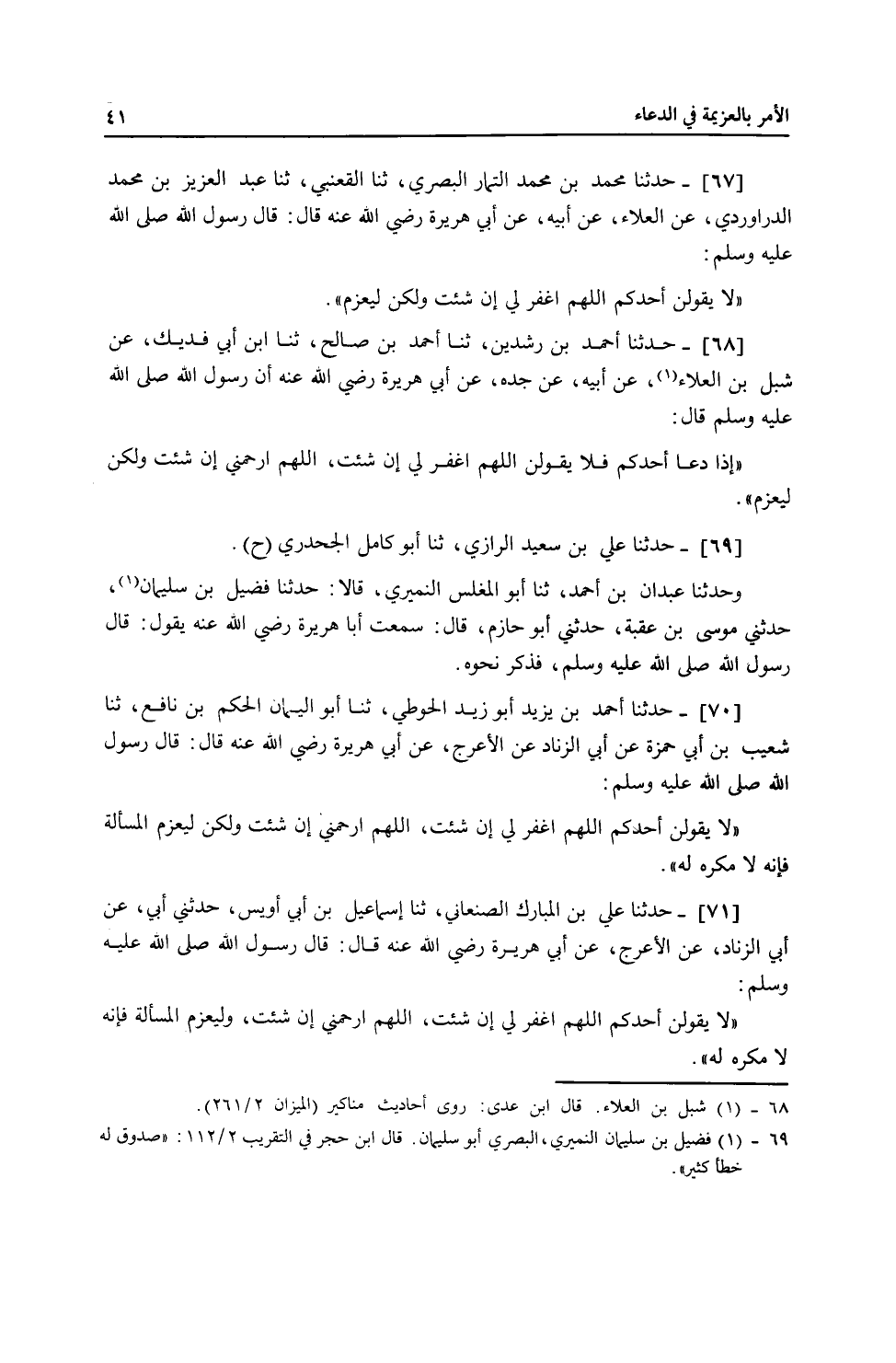 67 - حَدَّثَنَا مُحَمَّدُ بْنُ مُحَمَّدِ التَّمَّارُ الْبَصْرِيُّ، ثنا الْقَعْنَبِيُّ، ثنا عَبْدُ الْعَزِيزِ بْنُ مُحَمَّدٍ الدَّرَاوَرْدِيُّ، عَنِ الْعَلَاءِ، عَنْ أَبِيهِ، عَنْ أَبِي هُرَيْرَةَ، رَضِيَ اللَّهُ عَنْهُ قَالَ: قَالَ رَسُولُ اللَّهِ صَلَّى اللهُ عَلَيْهِ وَسَلَّمَ: «§لَا يَقُولَنَّ أَحَدُكُمُ اللَّهُمَّ اغْفِرْ لِي إِنْ شِئْتَ، وَلَكِنْ لِيَعْزِمْ»